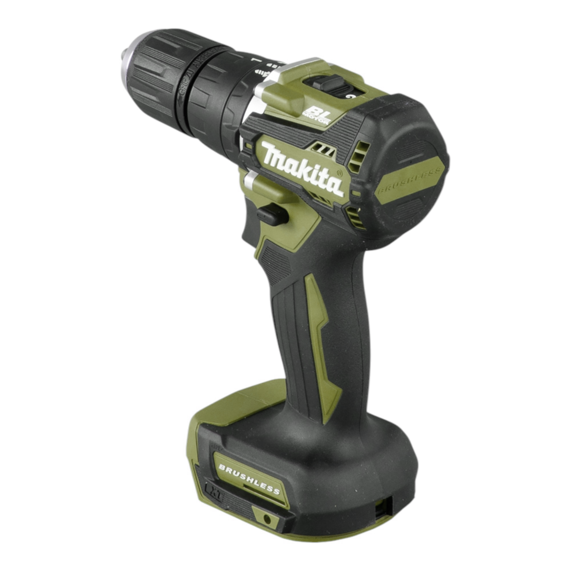The Makita DHP 487 is a very compact and versatile cordless impact drill. Its compact design makes it the ideal choice for working in hard-to-reach areas. The impact drill driver is equipped with a 2-speed planetary gearbox with a robust aluminium gearbox housing cover, which ensures easy screwing and drilling. In addition, the DHP 487 has a brushless motor (brushless), a motor brake, right/left rotation and a 13 mm quick-action drill chuck. In addition to drilling in wood and steel, the switchable percussion mechanism also enables drilling in masonry. Another feature is the built-in double LED with afterglow function, which provides good lighting conditions in poorly lit rooms. The ergonomically redesigned handle is intended to minimise damage to health, making long working days possible without any significant signs of fatigue. As part of the limited Outdoor Adventure series, the impact drill is presented in an attractive olive green colour, which also enhances its appearance.