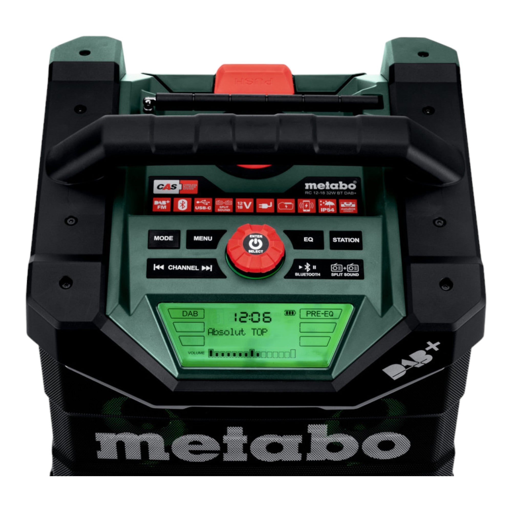 The Metabo RC 12 18 32 W BT DAB+ cordless jobsite radio is the perfect choice for anyone who doesn't want to miss out on rich sound and functionality on the jobsite or when travelling. This powerful DAB+ radio offers clear reception and a wide range of stations thanks to DAB+ and analogue FM reception, with eight presets available for each. An outstanding feature is the integrated charging function for battery packs and mobile devices. Battery packs can be charged in mains operation, while a USB-C charging option and wireless induction charging are available for smartphones. SplitSound technology makes it possible to expand the sound volume by synchronising the speaker of a second radio. The radio is equipped with Bluetooth, enabling wireless music playback from smartphones or tablets. An AUX-IN connection also allows the connection of wired music sources. Flexibility is offered by operation with all Metabo sliding seat battery packs from 12 to 18 volts or in mains operation. The robust plastic housing fulfils protection class IP 54 and is therefore splash-proof, dust-proof and shock-proof. Another practical feature is that each metaBOX can be stacked and coupled, allowing it to carry up to 40 kg. An integrated bottle opener provides additional convenience. Another highlight is its compatibility with the Cordless Alliance System (CAS), which means that the radio can be combined with all 18V battery packs and chargers from CAS brands. The Metabo RC 12 18 32 W BT DAB+ cordless jobsite radio therefore not only offers outstanding sound quality and versatile functions, but also a robust design and flexible application options that make it an indispensable companion on any construction site.