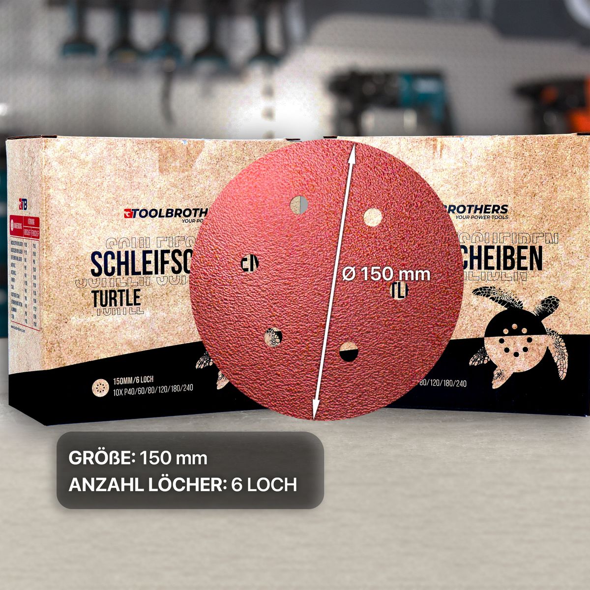 Metabo SXE 450 TurboTec Exzenterschleifer 350 Watt 150 mm ( 600129000 ) + 2x Toolbrothers TURTLE Schleifset 120x Schleifscheiben 150 mm Klett 6 Loch je 20x P40 / P60 / P80 / P120 / P180 / 240