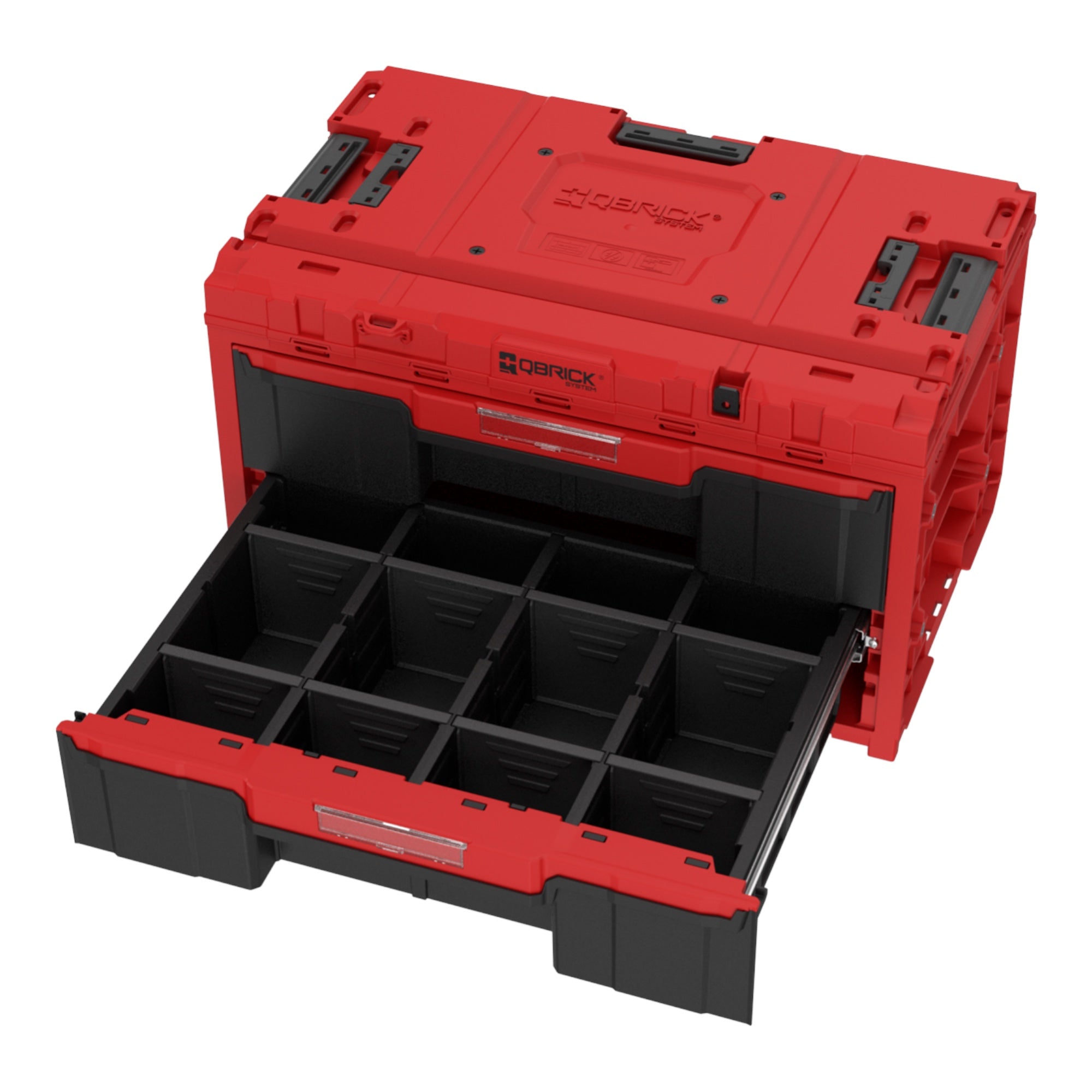 The Qbrick System ONE Drawer 2 Toolbox is a very spacious, modular toolbox. Equipped with two drawers that slide on metal guides. A practical button allows easy access to their contents. Two drawers of the same height are fitted with adjustable ABS dividers. 3 long and 8 short compartments allow the separation of 12 separate compartments of adjustable size. Polyamide side connectors allow easy connection to other modules in the ONE line. With the Vario+ cover, you can also connect the drawer to the PRO system. Convenient side handles in the body ensure that the module is easy to carry. The tool is labelled with a space for a label, which is protected by a polycarbonate cover. M8 threaded inserts installed in the body of the boxes allow for any personalisation (adaptation) of the box to the user's needs #letscustomize. There are also options on the back of the housing for hanging the module on the wall. To protect the drawer from theft of its contents, a steel latch is used that is suitable for use with a padlock. Qbrick System ONE Drawer is not compatible with ONE Transport Platform 1.0. The ONE Transport Platform 2.0 (EAN: 5901238259923) is dedicated to them. RED ULTRA HD is a special edition of Qbrick System PRO products made of extremely durable material that is exceptionally resistant to mechanical damage. The impact tests carried out confirm its exceptional durability, even in conditions below 0 °C.