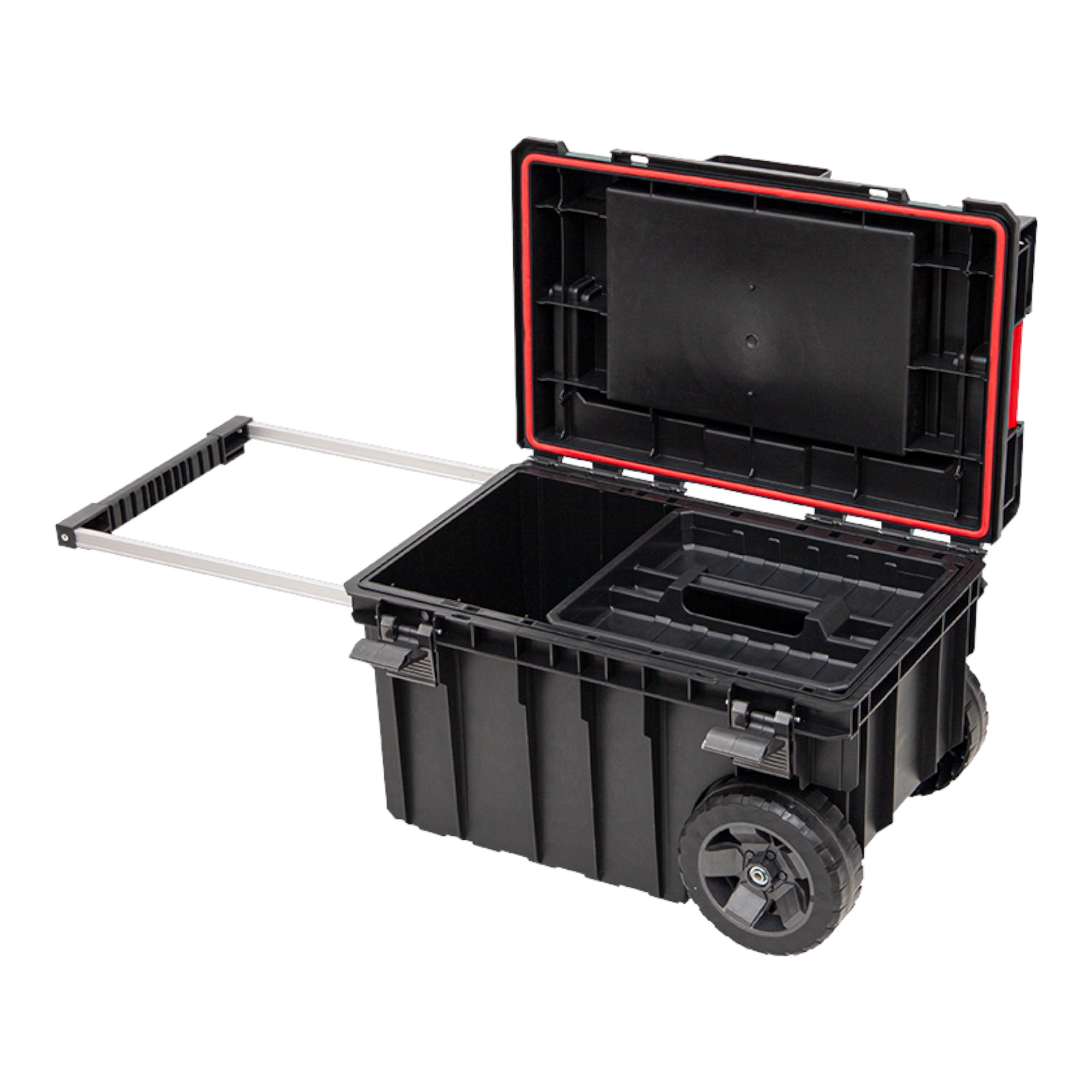 Large toolbox on wheels for excellent mobility of Qbrick modular systems. Two wheels mounted on a metal axle enable the safe transport of box sets and organisers. The aluminium telescopic handle, which can be pulled out to the side, provides convenient access to the inside of the box and allows the box to be carried comfortably in conjunction with other elements of the ONE line, which are attached with polyamide connectors. The simple pull-out handle mechanism of the double telescope locks into place when you lightly tap the handle from below. The contents of the box are equipped with a practical tray and a flexible seal that protects the contents of the box from the ingress of dust and water. The new EXPERT lid offers new storage options. Equipped with 8 buckets in different sizes, it enables the storage of small and long workshop accessories. The long aluminium handle ensures high ergonomics during transport.