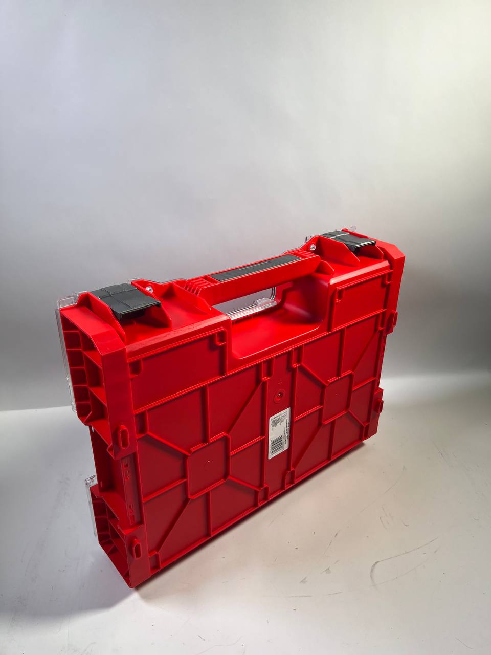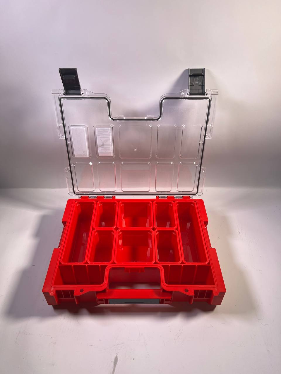 RED ULTRA HD is a special edition of Qbrick System PRO products made of ultra-resistant plastic, which is characterised by exceptional resistance to mechanical damage. The impact tests carried out confirm its exceptional durability, even in conditions below 0 °C. Qbrick System PRO Organiser 300 is the largest organiser model in the PRO line. In addition to the solutions known from other models, such as the patented Easy Access System, a seal in the lid, a super-sturdy polycarbonate lid, polyamide side connectors and front closures and a strong handle, it offers a deeper body that makes it more packable. It is equipped with 8 buckets in different sizes, including two long buckets for storing long workshop accessories.