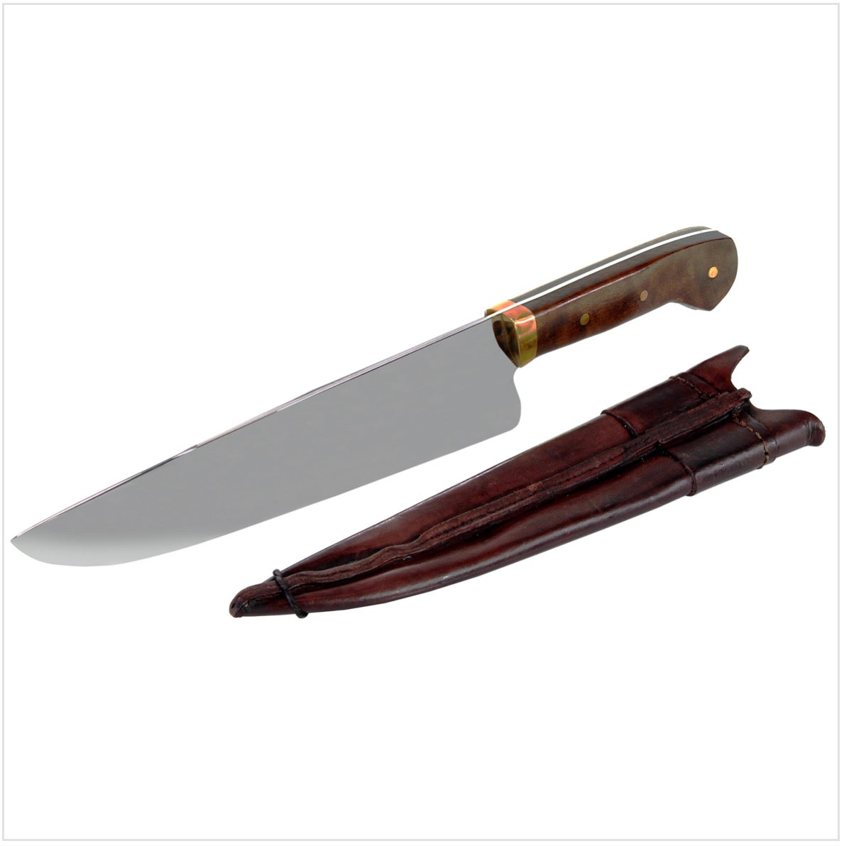 Ein herrliches Küchenmesser aus der hochwertigen Messerfertigung Serra Grande: Dieses handgefertigte Faca Picanheira, was übersetzt soviel bedeutet wie Messer das den Tafelspitz schneidet, ist das traditionelle Churrasco Messer der Köche in Südamerika. Die Köche schneiden das Fleisch dann direkt vom Spieß mit dem großen Messer auf die Teller der Gäste. Die Klingenlänge von 25,4 Zentimetern und die Klingenstärke von 3 Millimetern machen das Messer zur idealen Lösung beim Schneiden von Fleisch. Um höchsten Ansprüchen zu genügen, werden nur die besten Werkstoffe bei der Fertigung verwendet: Die Klinge besteht aus dem rostfreiem Schwedenstahl ( X46Cr13 / AISI 420 C ) der auch in der Solinger Messerfertigung benutzt wird. Dieser Edelstahl wird in der Fabrikation von Hand gehärtet und poliert, so daß eine edle und glänzende Optik entsteht. Der edle Griff wird aus dem Holz des Imbuia gefertigt, auch Pfefferbaum oder brasilianische Walnuß genannt. Das dunkelbraune Holz mit seiner kleinporigen Struktur weist dunkle Streifungen auf und wirkt optisch wie Nussbaumholz, obwohl es sich nicht um einen Nußbaum handelt. Es ist hart und langlebig, durch die sorgfältige Trocknung, Glättung und Politur überzeugt es mit einer wunderbaren Griffigkeit.