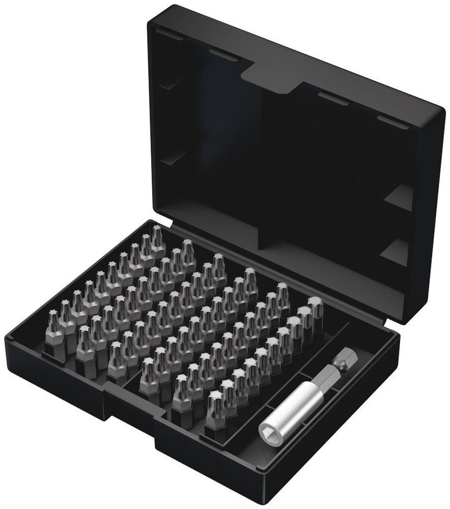 equipped with tough bits and bit holder with stainless steel sleeve, snap ring and strong permanent magnet - for manual and machine use (conventional cordless screwdriver) Contents 8000 377 261 (Bit-Safe Universal 4): 1 bit holder (50 mm long) 3 bits each for screws with internal TORX® profile size T 10 / 40 7 bits each for screws with internal TORX® profile size T 15 / 30 20 bits each for screws with internal TORX® profile size T 20 / 25