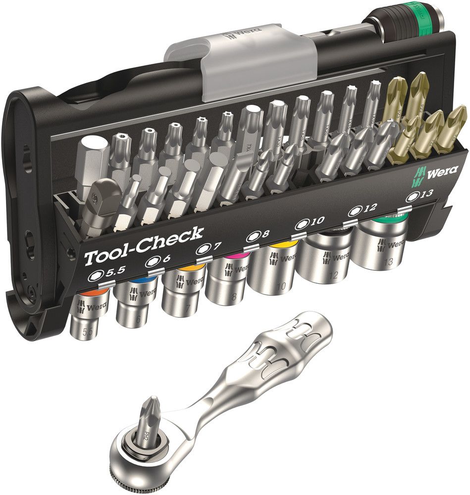 38 tools in the smallest space equipped with 28 bits, bit ratchet (Zyklop - drop-forged solid steel design with direct bit holder), bit holder with quick-change chuck (Rapidaptor technology) and 7 common socket spanner inserts, drive 6.3 mm (1/4″) - for manual and machine operation (conventional cordless screwdriver) Contents: 1 bit holder with quick-change chuck (Rapidaptor technology) (50 mm) 1 bit ratchet (87 mm) 1 bit for slotted screws 1 pc. Size 5.5 x 1.0 mm* for screws with cross recess (PH) 2 pcs. size 1 / 3 pcs. size 2 / 1 pc. Size 3* for screws with cross recess (PZD) 1 pc. Size 1 / 3 pcs. size 2 / 1 pc. Size 3** for screws with hexagon socket profile 1 pc. each Sizes 3 / 4 / 5 / 6 / 8 mm*** for screws with internal TORX® profile 1 each Size T 10 / 15 / 20 / 25 / 30 / 40* for screws with internal TORX® profile also with locking pin 1 pc. each Size T 10 / 15 / 20 / 25 / 30* 1 adapter 6.3 mm (1/4″) external square drive to 6.3 mm (1/4″) external hexagon drive 1 socket spanner bit 6.3 mm (1/4″) square drive SW 5.5 / 6 / 7 / 8 / 10 / 12 / 13 mm * tough with torsion zone ** extra hard with torsion zone *** tough with Hex-Plus technology