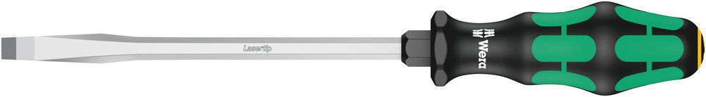 extra-strong design - with ergonomic multi-component power moulded handle with anti-roll protection - with hard grip zones for high working speed and soft grip zones for high torque transmission - extra-large hexagonal blade cross-section - nicromatt with laser tiptip - "bites" into the screw head and prevents it from slipping out of the screw head and protects against costly slips - most of the required contact pressure is eliminated - captive size guide system at the end of the handle as a time-saving identification aid for the respective screw type - with spanner aid for slotted screws
