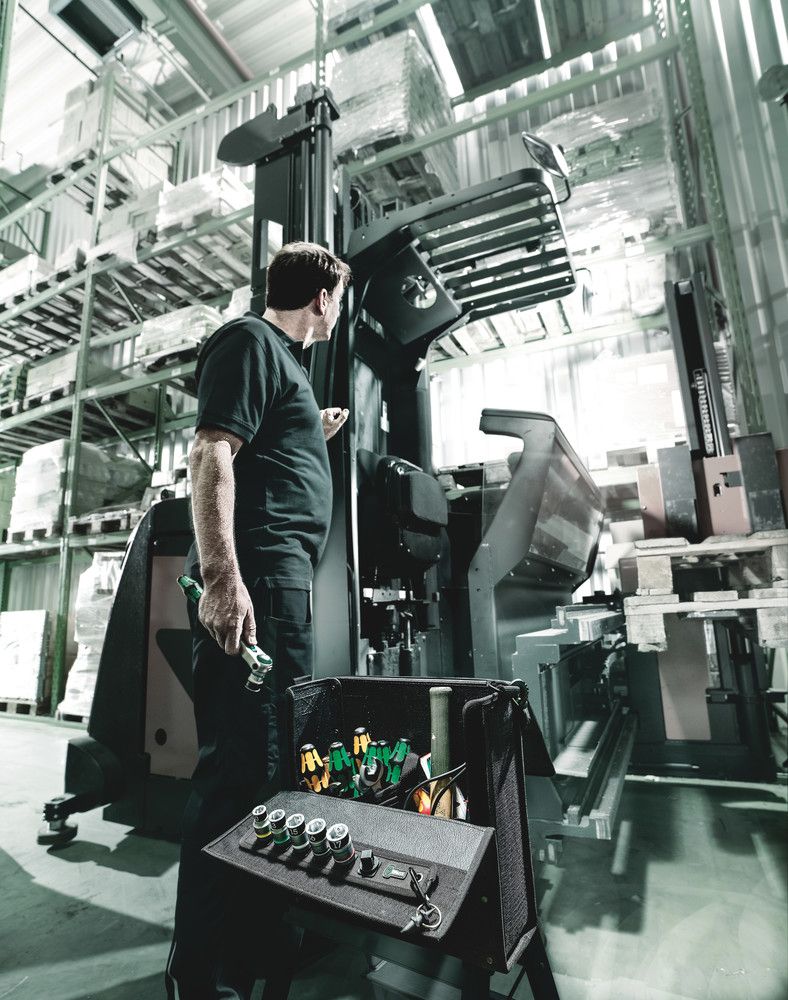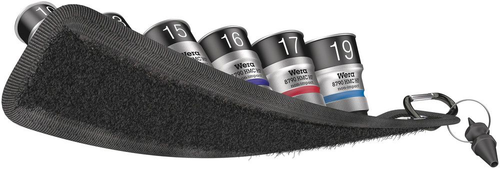12.5 mm (1/2″) square drive - with fleece backing and Velcro strips for easy attachment, e.g. to shelves, workshop trolleys and Wera 2go tool transport system - smooth-running rotating mechanism for safe storage and easy removal