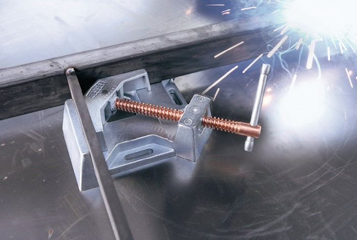 Herramienta de sujeción universal para fijar piezas en ángulo recto, incluso de distinto grosor - Mordazas y cuerpo base de fundición de alta calidad - Husillo con recubrimiento de cobre, por lo que también es especialmente adecuado para trabajos de soldadura - Fácil fijación a mesas de soldadura y mesas de máquinas gracias a los orificios alargados de los laterales - Margen angular: 5° - 180°