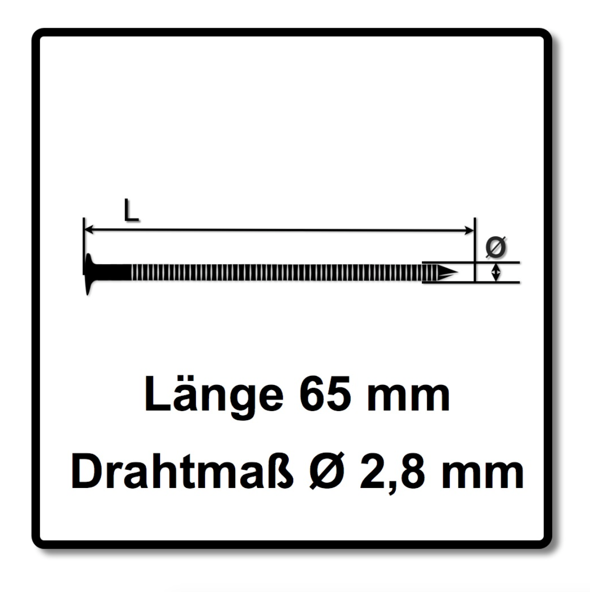 Los clavos en bobina de Bostitch tienen una longitud de 65 mm, un tamaño de alambre de 2,8 mm, una cabeza de 7,2 mm de ancho y son adecuados para clavadoras neumáticas de varios fabricantes.