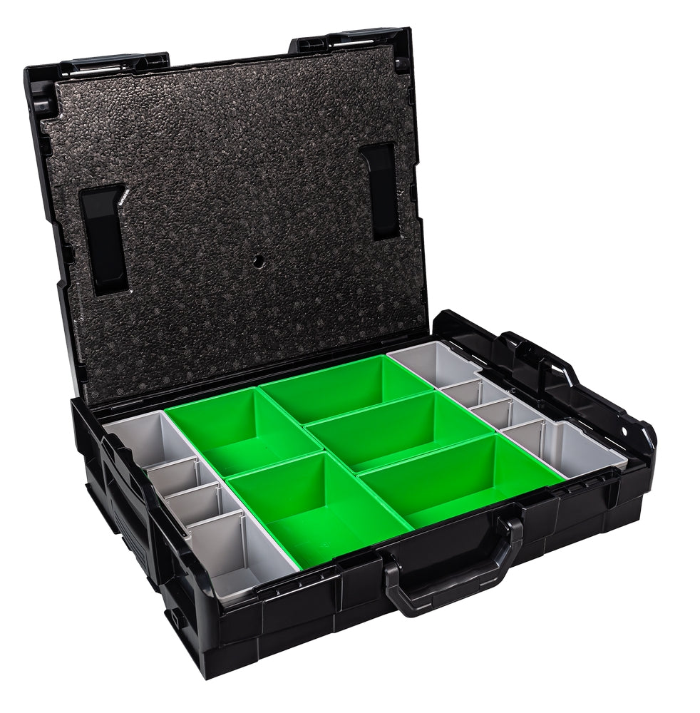 Con el juego Insetbox D3 LB 102 tendrá siempre a la vista sus piezas pequeñas. Tanto si las utiliza en su taller, en combinación con la L-BOXX o el sistema ProClick, caben en todas partes. El juego consta de 2 Insetbox U3 en gris, incluidos 6 separadores, y 5 Insetbox D3 en verde.