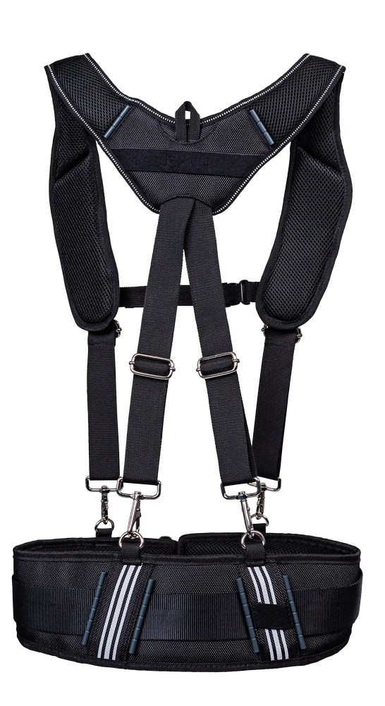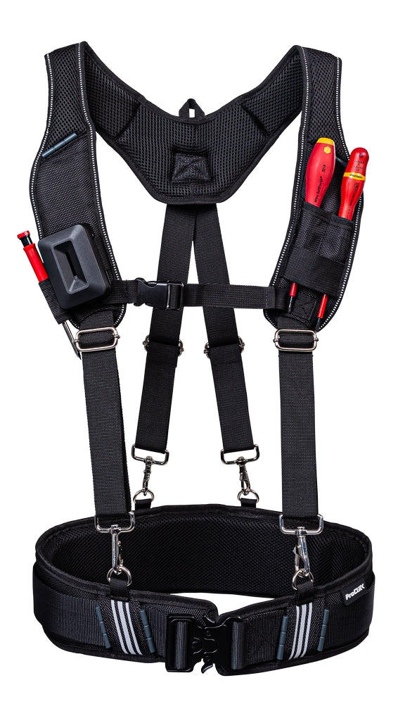 El ProClick Suspenders es un sistema de tirantes acolchados de 4 puntos diseñado específicamente para su uso con portaherramientas. Disponible en las tallas L/XL, los ProClick Suspenders se adaptan perfectamente a todas las tallas gracias a las correas ajustables en longitud. Los ProClick Suspenders están equipados con prácticos bolsillos, portabolígrafos y un lazo en la correa para enganchar el ProClick Holder, para que puedas organizar tus herramientas de forma eficaz y llegar a ellas más fácilmente. Los cuatro mosquetones también garantizan una conexión segura con el cinturón portaherramientas ProClick.