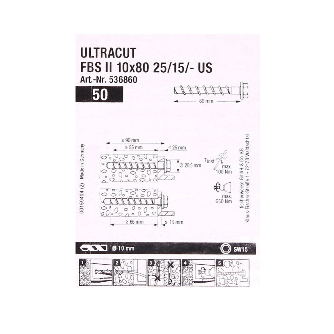- 1x tornillos para hormigón Fischer ULTRACUT FBS II 10x80mm 25/15/- 100 piezas (2x 536860)