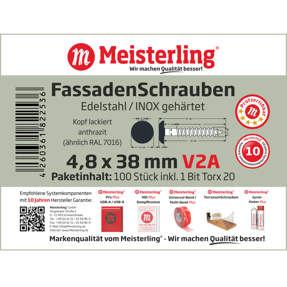 Tornillos para fachada Meisterling 4,8x38 mm 100 piezas (010020000211) 12 mm cabeza plana antracita con rosca parcial Torx Acero inoxidable V2A