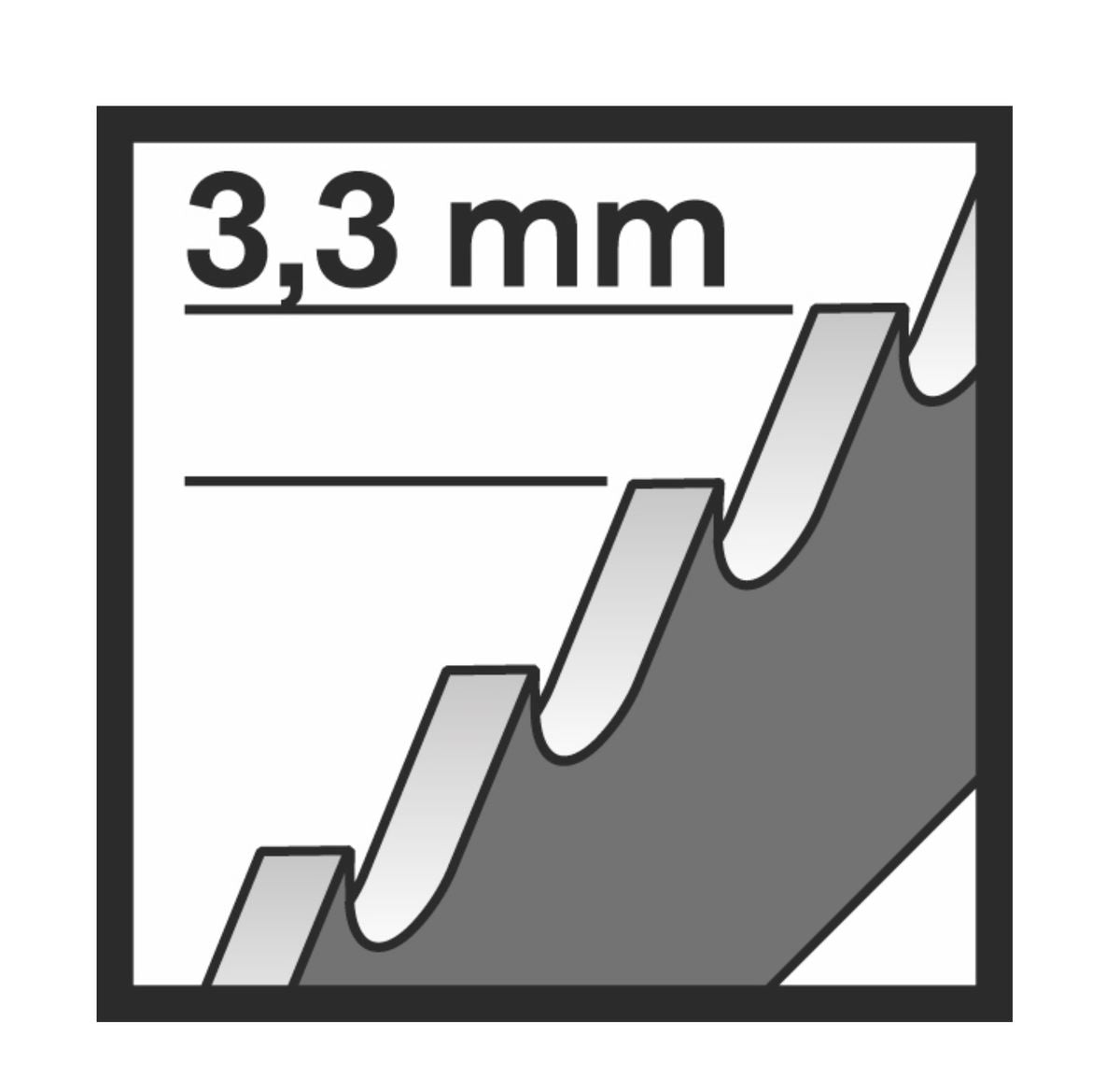 La lame de scie sauteuse T 301 CHM de Bosch est très robuste et idéale pour les coupes droites et nettes dans le plastique. La barre de dents rectifiée est soudée au corps en acier inoxydable hautement élastique grâce à la technologie Carbide. Ainsi, le travail sur des surfaces très robustes telles que le Corian, le Varicor et les WPC (composites bois-plastique) est aisé. Le pas de ses dents de 3,3 mm et sa longueur de 117 mm assurent également des coupes dans des éléments composites en plastique abrasif, des profilés et des tiges pleines jusqu'à une épaisseur de 65 mm. Cette lame de scie est compatible avec toutes les scies sauteuses traditionnelles dotées d'un arbre en T.