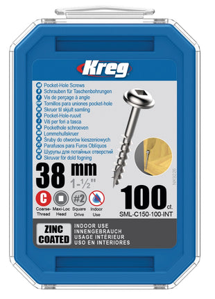 KREG Vis à tête bombée Pocket-Hole 38mm 100 pces ( SML-C150-100 ) Entraînement carré Filetage partiel Filetage grossier autotaraudeur galvanisé