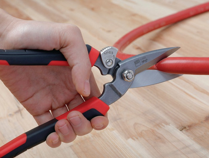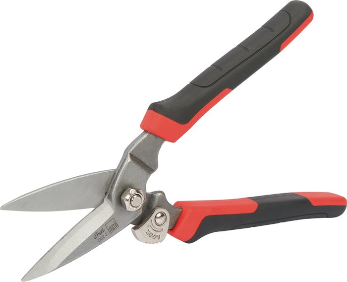 Tagliente e impugnatura in un unico pezzo - forgiato - tagliente seghettato per lavorare senza scivolare - impugnatura ERGO per lavorare senza fatica - lame sabbiate e cromate per proteggere dalla corrosione - taglia acciaio laminato a freddo fino a 0,6 mm di spessore - confezione SB