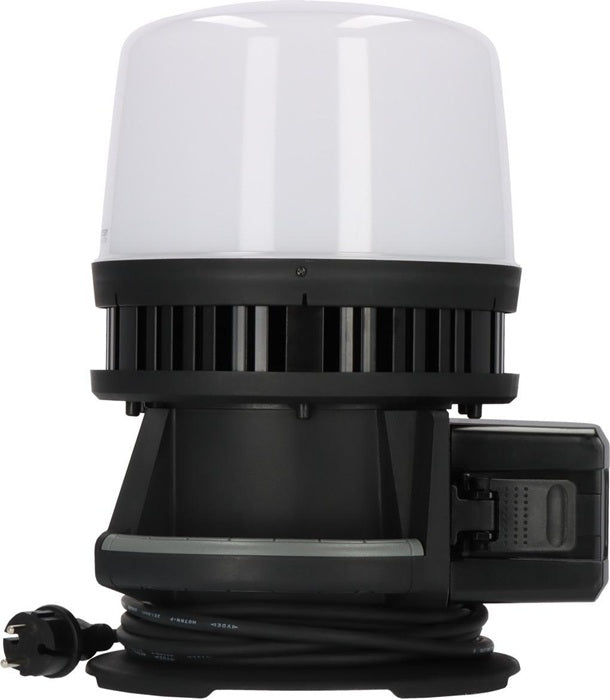 potente faretto da costruzione ibrido Multi Battery LED 360° - resistente alla polvere e agli spruzzi d'acqua - compatibile con undici sistemi di batterie da 18 V dei produttori di elettroutensili: Bosch Professional, Dewalt, Einhell, Fein, Festool, Flex, Hikoki, Makita, Metabo CAS, Milwaukee e Würth - interruttore on/off, che può essere utilizzato anche per controllare i 4 livelli di accensione (100% - 75% - 50% - 25% di luce) - tecnologia ibrida: Possibilità di funzionamento a rete e a batteria - con cavo da 5 m installato in modo permanente (H07RN-F2X1.0) - indicatore di stato della batteria - riavvolgimento del cavo - gancio per appendere - utilizzo flessibile: in piedi, appeso, montabile su treppiede - durata della luce a seconda della batteria utilizzata: ca. 12 min/1Ah al 100% di luce, circa 16 min/1Ah al 75% di luce, circa 24 min/1Ah al 50% di luce, circa 48 min/1Ah al 25% di luce - Temperatura colore: 6500K - Grado di protezione: IP54 - Resistenza agli urti: IK08