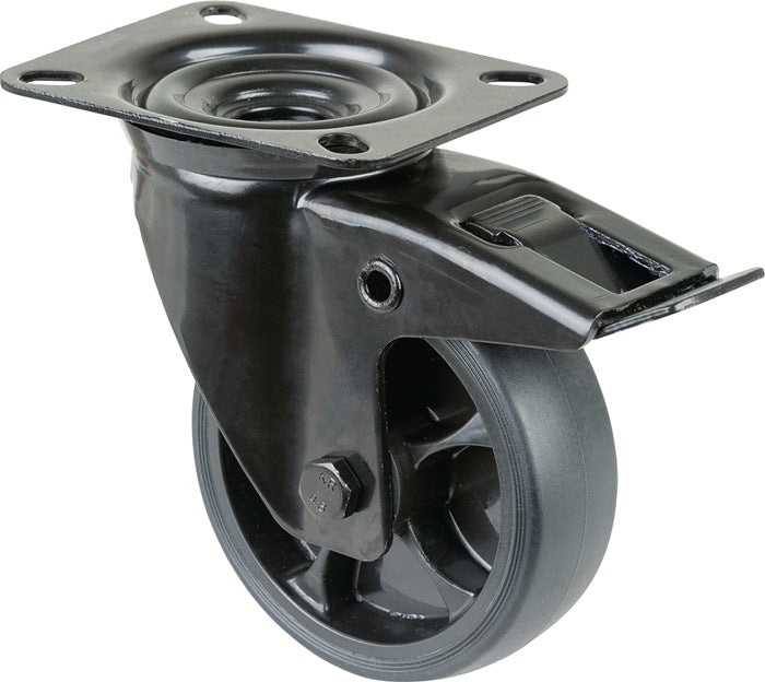 Ruota per carrelli con blocco totale · ruota in gomma termoplastica nera · corpo ruota in plastica nera · cuscinetto a rulli · con fissaggio a piastra