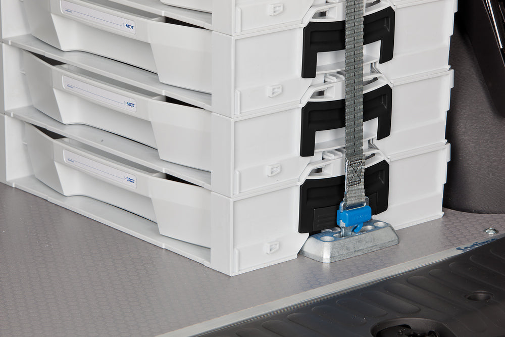 Il ProSafe Halter Set LB consente di trasportare in modo sicuro e stabile le borse L-BOXX, LS-BOXX, i-BOXX o anche la ProClick Tool Bag M e la Soft Bag M nel veicolo. Il supporto si avvita facilmente al pavimento del veicolo e può essere utilizzato insieme alla cinghia con fibbia ProSafe per fissare saldamente le cassette degli attrezzi e le borse durante il trasporto.