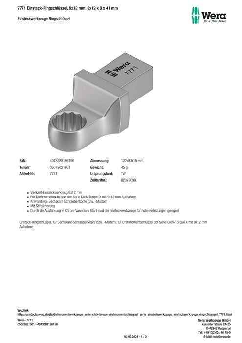 Chiave a scatola Wera 7771 ( 8000377411 ) Larghezza tra i piani 8 mm 9 x 12 mm