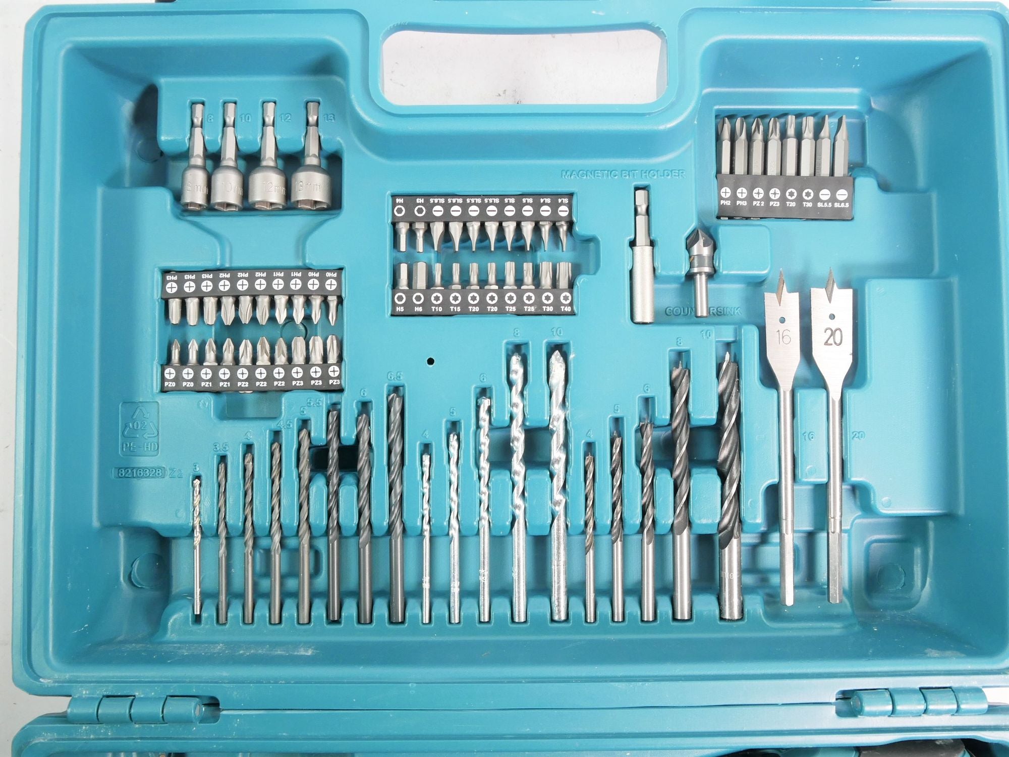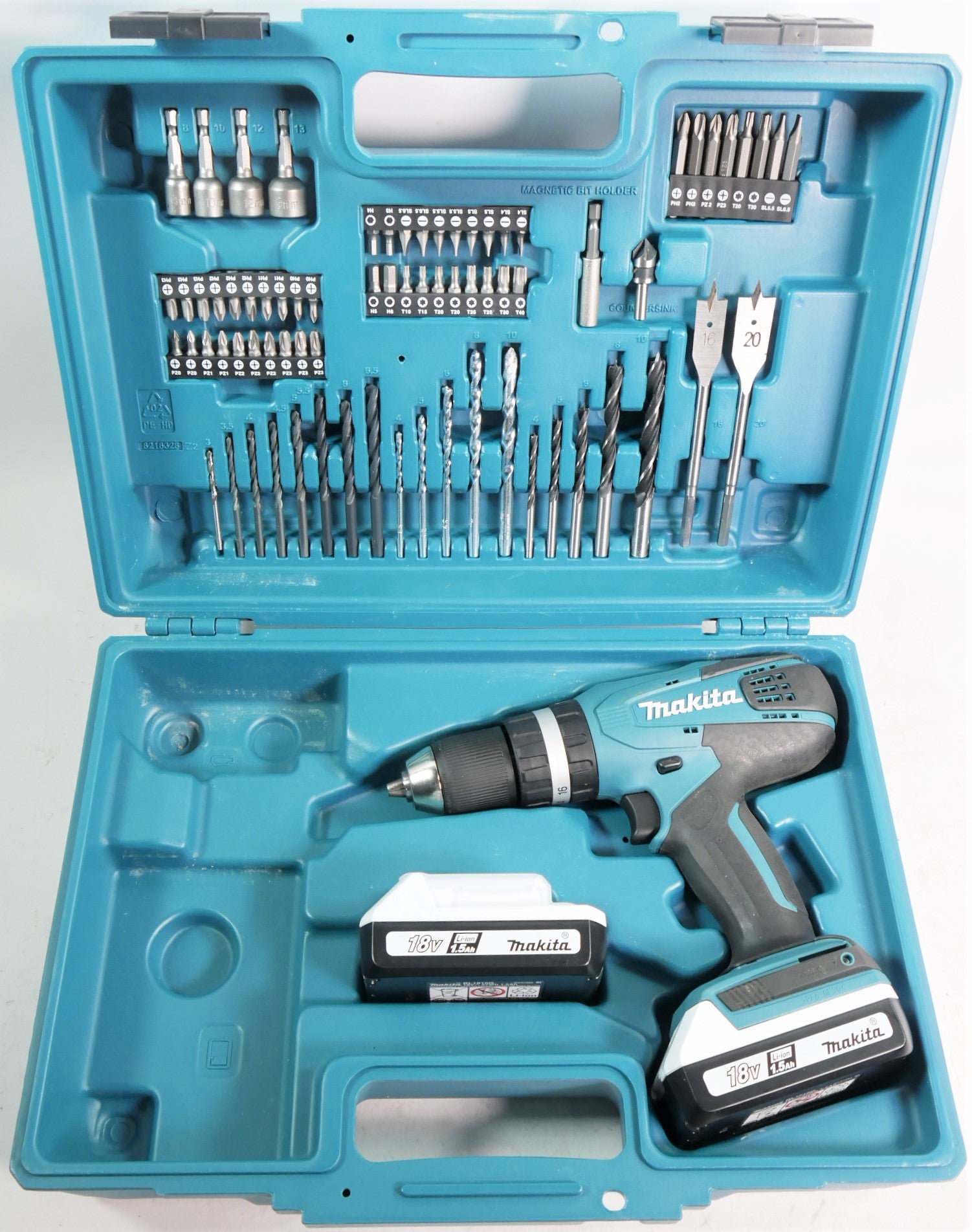 Makita HP 457 DWE Trapano avvitatore con percussione a batteria 18V + 2x Batterie 1,5 Ah + Caricabatterie DC 18 WA + Set di punte da 74 pezzi