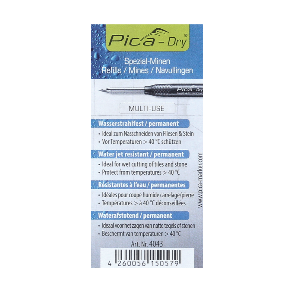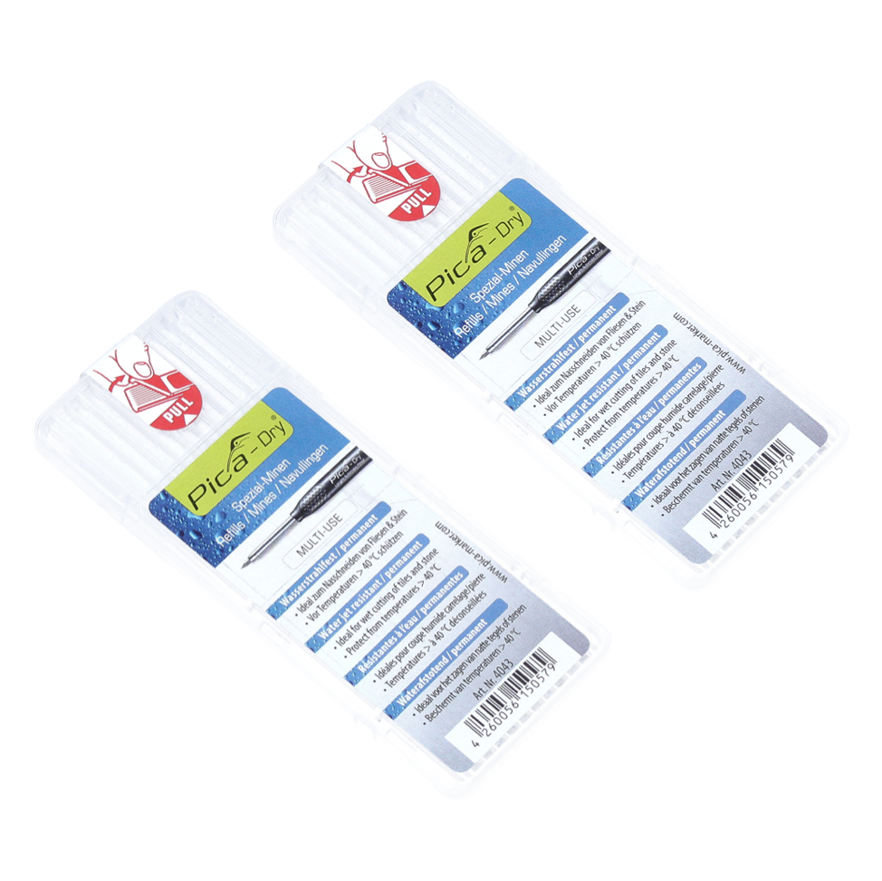 Die Pica Dry Spezialminen sind für den Arbeitseinsatz auf fast allen Oberflächen geeignet, egal ob glatt oder rau, trocken oder feucht, staubig oder ölig. Die wasserstrahlfesten Minen eignen sich besonders zum Markieren beim Nassschneiden von Fliesen und Stein. Die Pica Dry Spezialminen sind Chlorid-frei.
