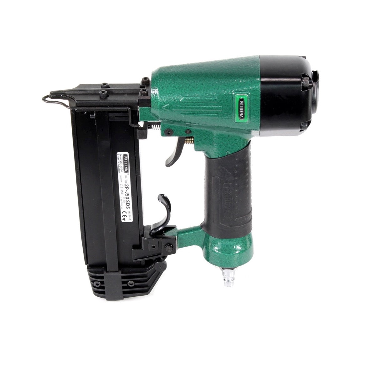 La chiodatrice pneumatica modello 2P-J50SDS di Prebena è fornita in una pratica valigetta per il trasporto. È adatta per chiodi verticali di tipo J da 16 a 50 mm. Con una pressione di lavoro di 5-7 bar, la 2P-J50SDS è ideale per un'ampia gamma di applicazioni come tappezzeria, decorazioni, battiscopa, modanature per soffitti, cornici, modanature decorative, fermavetri, cornici e molto altro. Il dispositivo di sicurezza del grilletto e il silenziatore garantiscono un lavoro confortevole e sicuro.