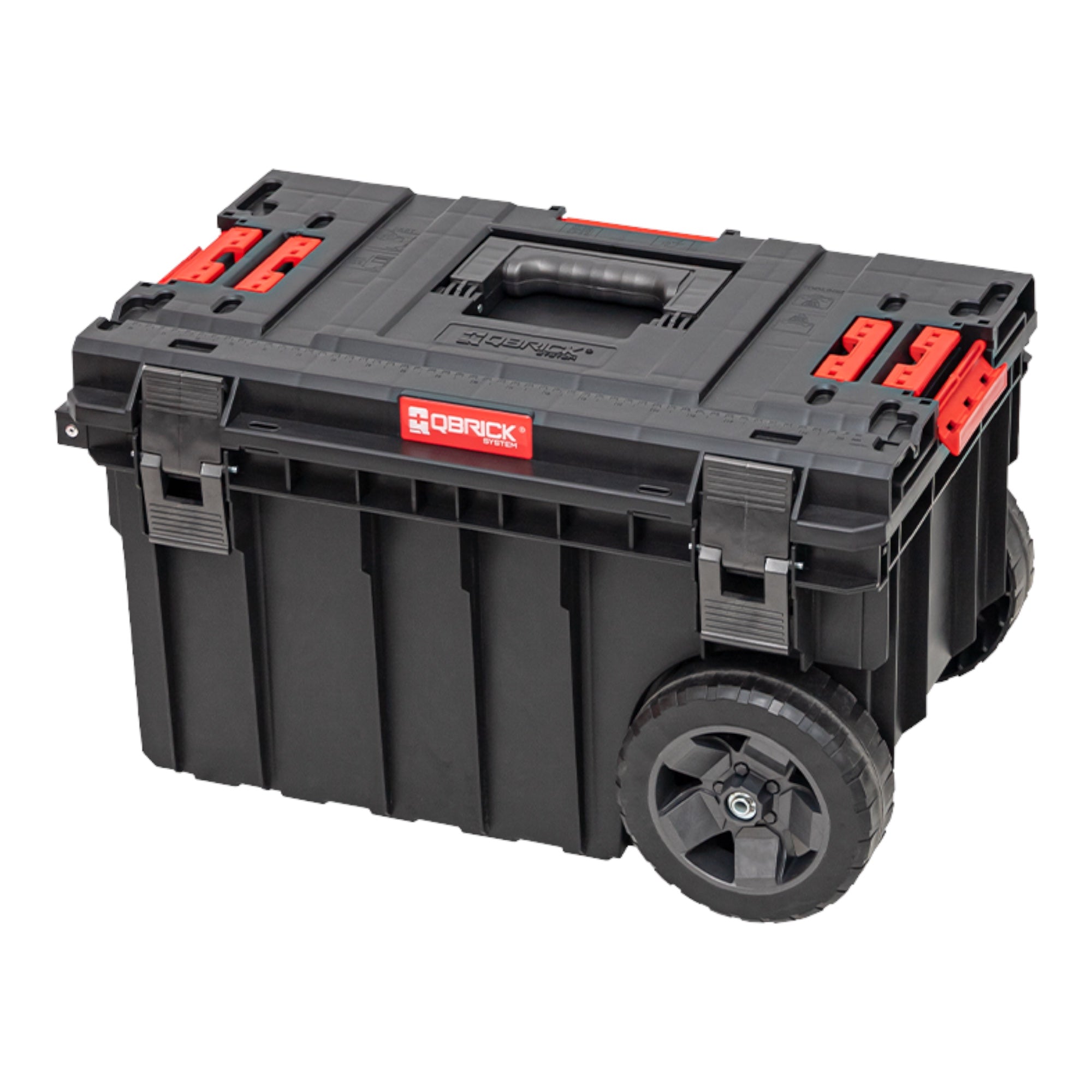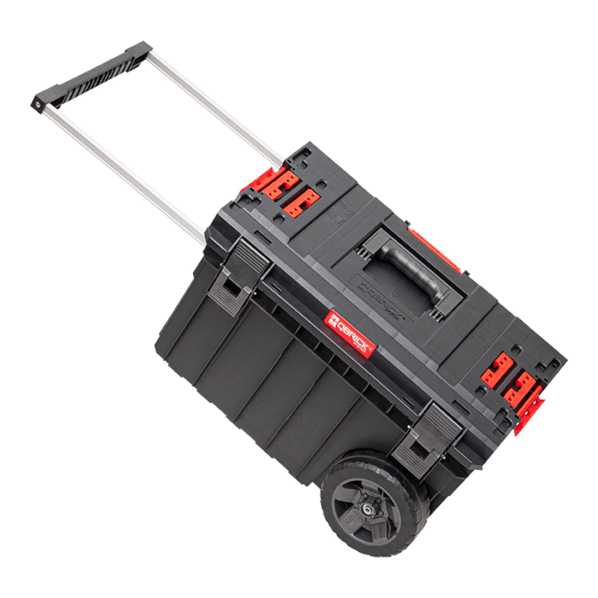 Grande cassetta degli attrezzi su ruote per un'eccellente mobilità dei sistemi modulari Qbrick. Due ruote montate su un asse metallico consentono di trasportare in sicurezza i set di scatole e gli organizzatori. Il manico telescopico in alluminio, estraibile lateralmente, consente di accedere comodamente all'interno della cassetta e di trasportarla insieme agli altri elementi della linea ONE, fissati con connettori in poliammide. Il semplice meccanismo di estrazione della maniglia a doppio telescopio si blocca in posizione quando si dà un leggero colpetto alla maniglia dal basso. Il contenuto della scatola è dotato di un pratico vassoio e di una guarnizione flessibile che protegge il contenuto della scatola dall'ingresso di polvere e acqua. Il coperchio standard VARIO è dotato di connettori aggiuntivi che consentono di collegare questa versione del coperchio ai modelli Toolbox della linea Qbrick System PRO (500, Toolcase, Toolbox, Organiser 100, 200, 300 e in alternativa PRO 600). Si tratta di una versione unica del box, grazie alla quale l'utente può combinare elementi di due linee di prodotti.