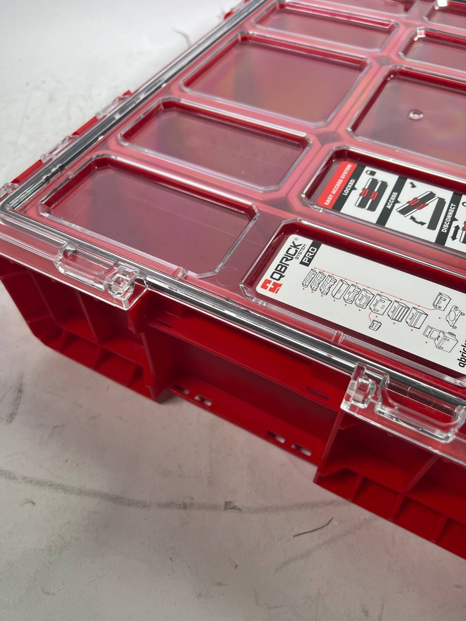 RED ULTRA HD ist eine Sonderedition von Qbrick System PRO-Produkten aus ultrabeständigem Kunststoff, der sich durch außergewöhnliche Beständigkeit gegen mechanische Beschädigungen auszeichnet. Die durchgeführten Schlagtests bestätigen seine außergewöhnliche Haltbarkeit, auch bei Bedingungen unter 0 °C. Qbrick System PRO Organizer 300 ist das größte Organizer-Modell aus der PRO-Linie. Neben den von anderen Modellen bekannten Lösungen, wie dem patentierten Easy Access System, einer Dichtung im Deckel, einem superstabilen Polycarbonat-Deckel, Polyamid-Seitenverbindern und -Frontverschlüssen und einem starken Griff, bietet es einen tieferen Körper, der macht es packbarer. Es ist mit 8 Eimern in verschiedenen Größen ausgestattet, darunter zwei lange Eimer zur Aufbewahrung von langem Werkstattzubehör.