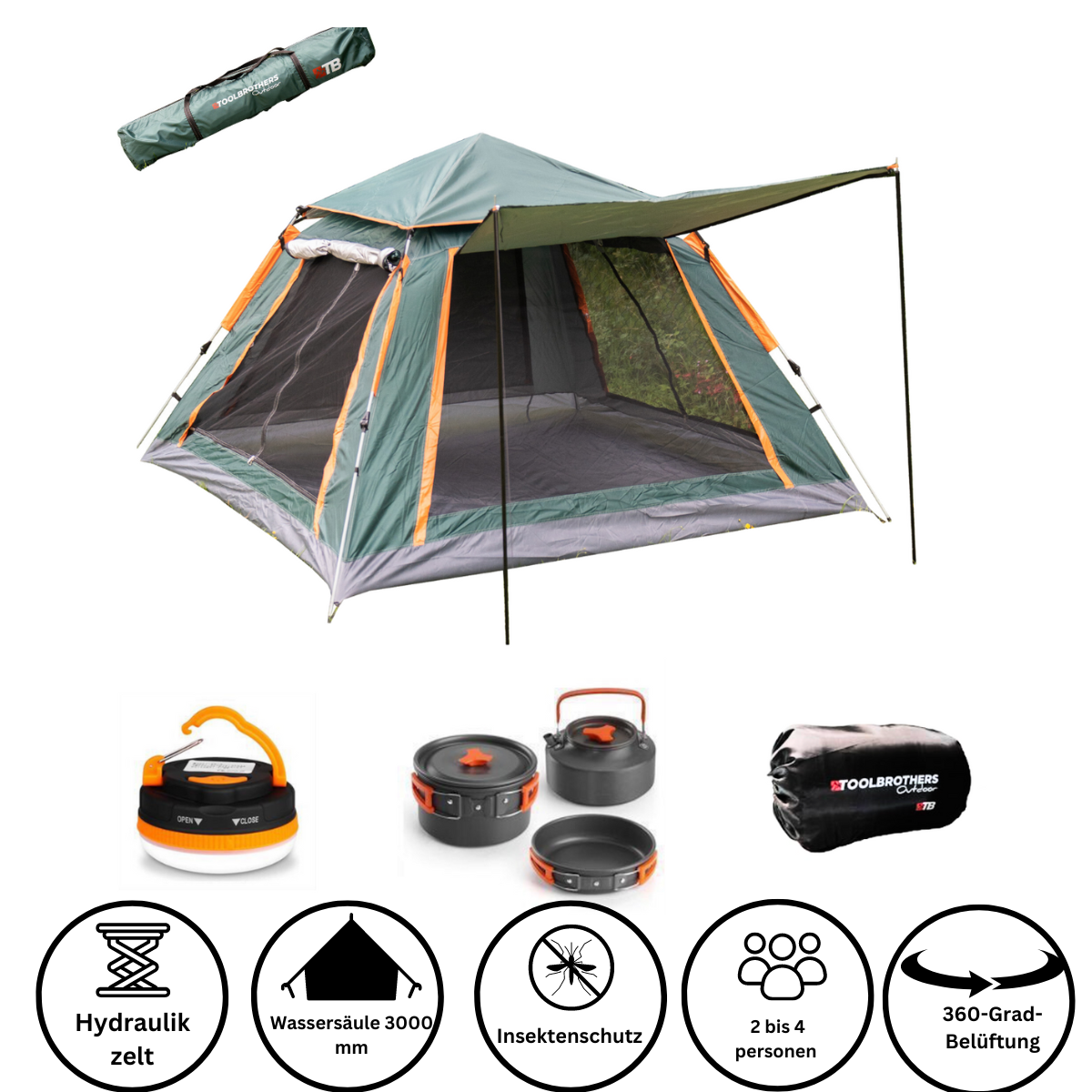 Il set da campeggio Toolbrothers è un set di alta qualità, che contiene una selezione di prodotti progettati per un'esperienza di campeggio confortevole, la tenda da campeggio Toolbrothers è appositamente progettata per l'uso all'aperto. Può ospitare 2-4 persone ed è perfetta per i viaggi in campeggio o per altre avventure all'aperto. La tenda è realizzata in tessuto impermeabile 210D Oxford, che garantisce un'impermeabilità affidabile e duratura. Inoltre, la copertura superiore è a prova di rugiada per garantire una maggiore protezione dall'umidità. La tenda è dotata di una ventilazione a 360 gradi, che garantisce una circolazione ottimale dell'aria. Questo è particolarmente importante per ridurre al minimo la formazione di condensa all'interno della tenda e per creare un clima interno piacevole. Le fessure di ventilazione possono essere aperte o chiuse a seconda delle condizioni atmosferiche e delle preferenze personali. La tenda è inoltre dotata di una zanzariera che tiene lontani gli insetti fastidiosi e permette di dormire indisturbati. La tenda può essere montata rapidamente e senza sforzo grazie alla nostra innovativa tecnologia. Anche una sola persona può montarla facilmente in pochi secondi. Il set comprende una lampada da campeggio a LED ad alta efficienza energetica, portatile e in grado di fornire una piacevole illuminazione intorno al campo, e un sacco a pelo appositamente progettato per una persona. Con una dimensione di 220 x 75 cm, offre spazio sufficiente per un sonno riposante durante il campeggio, e comprende anche un set di pentole da campeggio da 10 pezzi. Include una selezione di pentole, padelle, caffettiera e posate per aiutarvi a preparare i vostri pasti all'aperto. Non sono specificati ulteriori dettagli sui componenti specifici del set di pentole. Con questo set completo potrete vivere un'esperienza di campeggio comoda e ben equipaggiata, senza preoccuparvi di nulla.