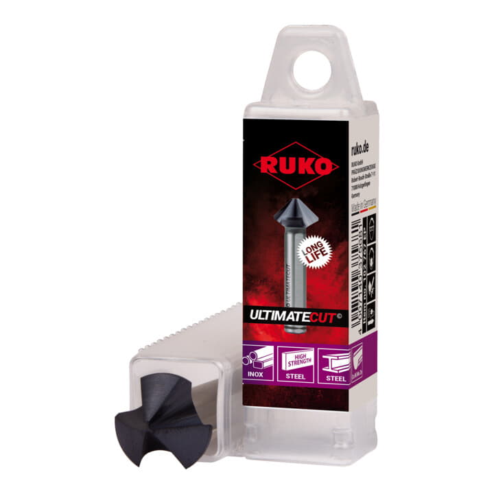 La geometria del tagliente completamente nuova dell'ULTIMATECUT di RUKO riduce notevolmente le forze assiali e radiali che agiscono sull'utensile durante il processo di svasatura. Il sottosquadro variabile, appositamente sviluppato, garantisce un processo di svasatura molto fluido. In questo modo si ottiene una superficie di svasatura precisa, tonda e priva di sbavature, garantendo così i migliori risultati. I parametri di evacuazione del truciolo appositamente sviluppati, come l'angolo di spoglia, il raggio di transizione e la scanalatura extra larga, assicurano una rimozione ottimale del truciolo e del calore, consentendo una resistenza all'usura molto elevata. Inoltre, la nuova geometria contrasta la saldatura del materiale e riduce enormemente le forze di svasatura. Durante il processo di svasatura è necessaria una forza di avanzamento notevolmente inferiore. I materiali possono essere lavorati a velocità di taglio molto elevate o basse senza alcuna perdita di qualità della svasatura. ULTIMATECUT raggiunge le migliori prestazioni in quasi tutti i materiali e le applicazioni.