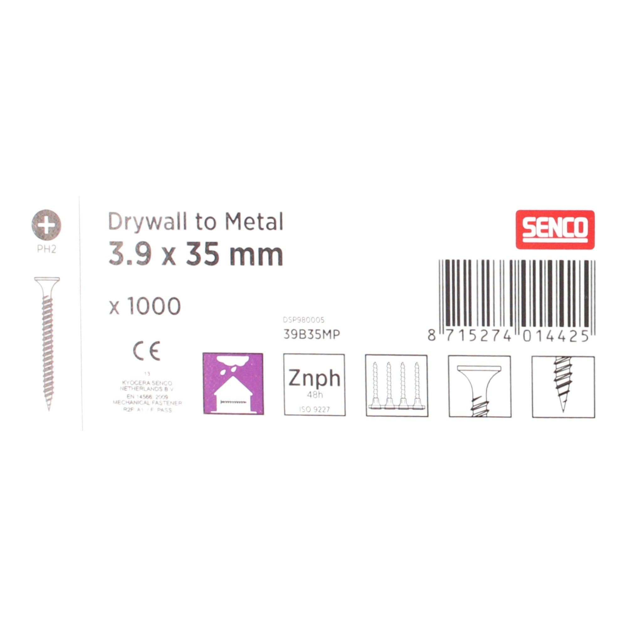 Le viti per cartongesso SENCO sono ideali per l'uso su pareti a secco con acciaio leggero. Con un diametro di 3,9 mm e una lunghezza perfetta per borchie metalliche da 1 mm, queste viti fosfatate garantiscono un fissaggio affidabile e stabile del cartongesso.