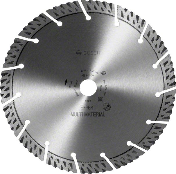 Die Bosch EXPERT MultiMaterial Diamant Trennscheibe gewährleistet eine hohe Lebensdauer in verschiedenen Baumaterialien wie Beton, Ziegel, Dachziegel und Stahlbeton. Die Reibungsreduzierten Seitenflächen an den Segmenten dienen zur Minimierung von Verschleiß an den Seiten. Dank der 22,23 mm Bohrungsdurchmesser ist diese Trennscheibe für alle Standard Winkelschleifer mit Spannmutter geeignet. Dank der "Bosch Diamond Technology" ist es gelungen, ein hochwertige und langlebige Trennscheibe zu bauen, die dem Anwender viel Freude bereitet. Das Bosch EXPERT Sortiment ist das innovativste Zubehör für Elektrowerkzeuge mit nachgewiesenen Leistungsvorteilen, um jeden Profi Handwerker höchst effizientes Arbeiten zu ermöglichen. Extrem lange Lebensdauer, maximale Präzision, arbeiten mit Höchstgeschwindigkeit und staubfreieres Schleifen: all das ist mit Bosch EXPERT möglich.