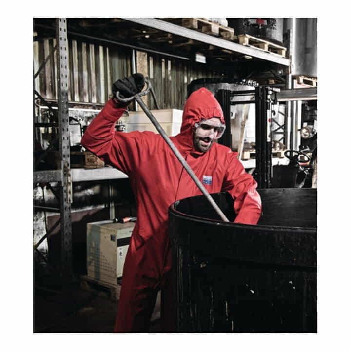 EN 14605 (Typ 4), EN ISO 14116 Index 1 (5/H/40), EN 1149-1, Kat. III aus elastomerisiertem Spezial-PVC · flammhemmend und antistatisch · integrierte Kapuze mit Elastikzug · Frontreißverschluss mit doppelter Abdeckung und Klettband · Schutzlatz am oberen Reißverschlussende für besseren Abschluss · großer innerer Brustkeil zur Erhöhung der Sicherheit, durch Klettband fixierbar · Tailleneinstellung durch fixierbares Elastikband · Ärmelenden – innere Sicherheitsabschlüsse · Beinenden – Keilausstellung mit Klettriegeln für bequemes Überziehen · Anwendungsbereiche: Chemikalienschutz, Tankreinigung, Bordanzug Speditionen, Entsorgung/Sanierung