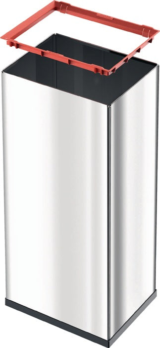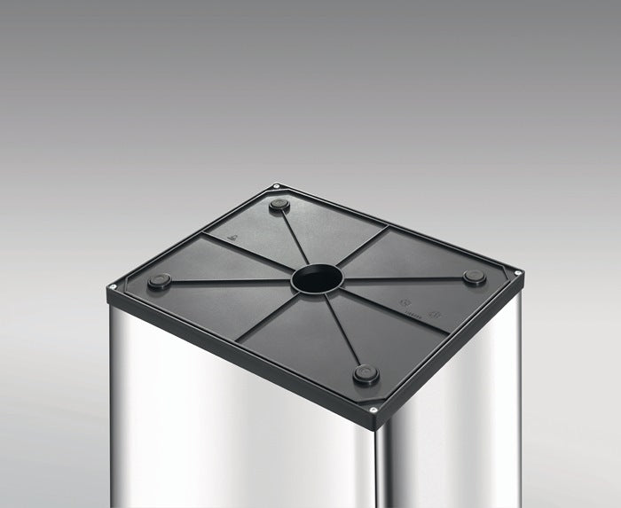 Inhalt 52 l · Deckel und Boden aus hochfestem schwarzem Kunststoff · Gehäuse aus pulverbeschichtetem Stahlblech · zweigeteilter Schwingdeckel schließt selbstständig, Verrastung zum kompletten Öffnen des Schwingdeckels möglich · mit Müllbeutel-Klemmrahmen · Boden mit 4 Anti-Rutsch-Füßen · Lieferung erfolgt zerlegt, einfache Montage