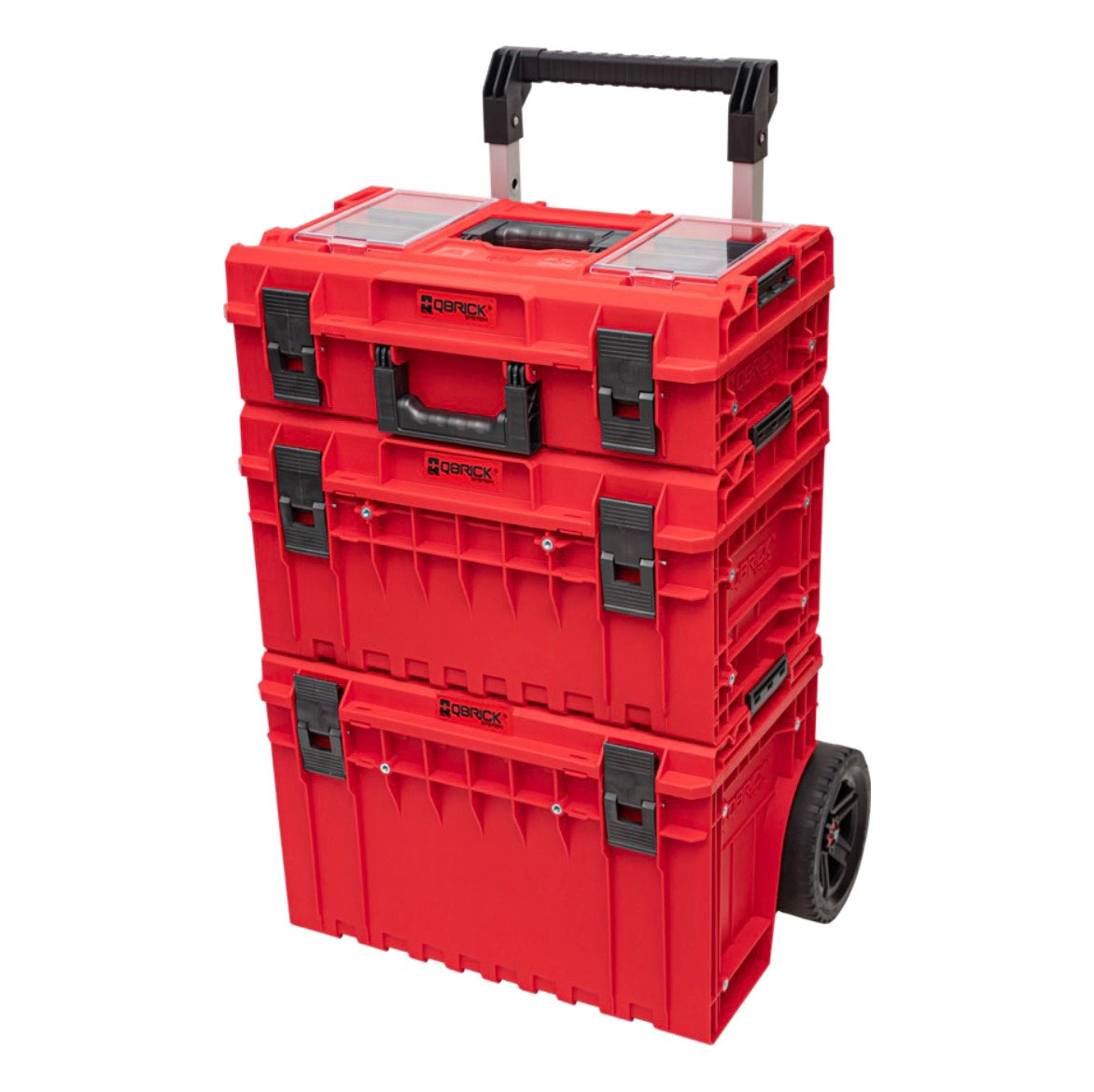 RED ULTRA HD ist eine Sonderedition von Qbrick System ONE-Produkten aus ultrabeständigem Kunststoff, der sich durch außergewöhnliche Beständigkeit gegen mechanische Beschädigungen auszeichnet. Die durchgeführten Schlagtests bestätigen seine außergewöhnliche Haltbarkeit, auch bei Bedingungen unter 0 °C. QS ONE Cart RED Ultra HD ist ein mobiler Werkzeugkasten mit großem Fassungsvermögen, der mit großen Rädern ausgestattet ist, die auf einer Metallachse montiert sind. Er ist mit einem Teleskopstiel aus eloxiertem Aluminium ausgestattet. Zur besseren Organisation des Innenraums ist die Box mit zwei Ablagen und zwei Fächern ausgestattet. Die Version 2.0 der ONE-Produktlinie ist eine neue Generation von Werkzeugkästen und Organizern mit einem verstärkten Design. Durch die zusätzliche Anpassung der Gehäuse an M8-Gewindeeinsätze kann das System an die Bedürfnisse des Anwenders angepasst werden. Die Custom-Version dieses Kastenmodells ist mit zehn Gewindeeinsätzen der Größe M8 ausgestattet, die eine individuelle Anpassung durch den Benutzer ermöglichen. Die Standardabdeckung (VARIO) im QS ONE Cart ist mit zusätzlichen Anschlüssen ausgestattet, die es ermöglichen, diese Version der Abdeckung mit den Toolbox-Modellen aus der Qbrick System PRO-Linie (500, Toolcase, Toolbox, Organizer 100,200,300 und alternativ PRO 600) zu verbinden. Dies ist eine einzigartige Version der Box, dank der der Benutzer Elemente aus zwei Produktlinien kombinieren kann.