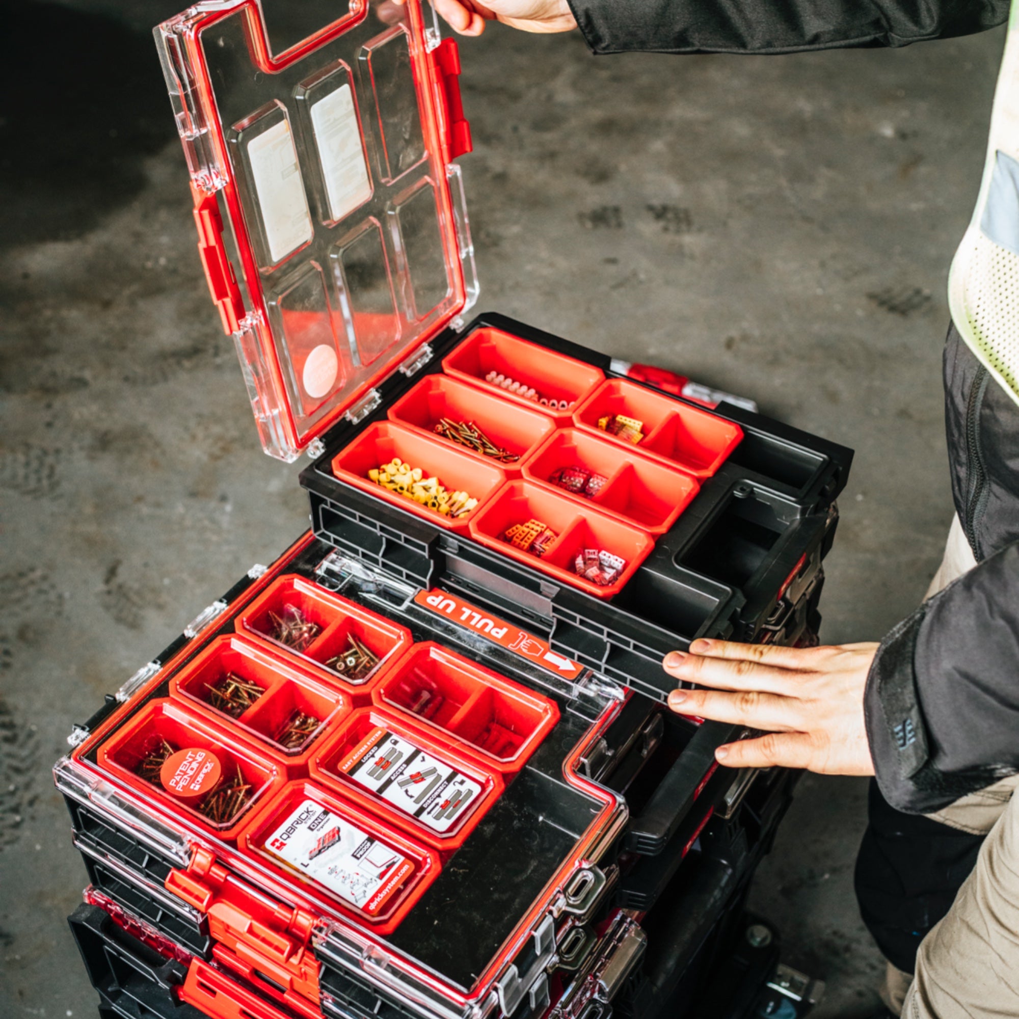 Qbrick System ONE Organizer M ist das kleinste Modell aus der Reihe modularer ONE Organizer, die in vielen Konfigurationen miteinander kombiniert werden können. Organizer M verfügt über das patentierte Easy Access System, das dank spezieller Verbindungsstücke einen einfachen Zugang zu jedem Modul ermöglicht, ohne dass sie gelöst werden müssen, was die Arbeitsergonomie erheblich erhöht. Standardmäßig ist der Organizer M mit 5 Eimern für kleineres Zubehör ausgestattet, darunter 4 kleinere und ein langer zum Aufbewahren und Transportieren von Längselementen Ihrer Werkstatt. Zusätzlich wird der Inhalt des Organizers durch eine flexible Dichtung, die in der Polycarbonatabdeckung angebracht ist, vor dem Eindringen von Wasser und Staub geschützt.