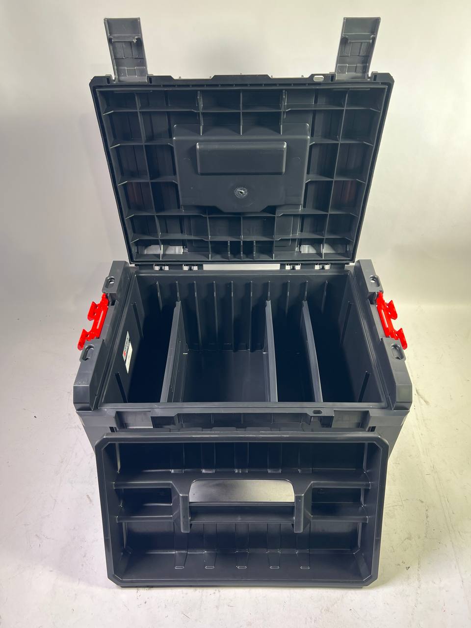 Die Qbrick System PRO Toolbox ist eine geräumige, modulare Werkzeugbox, die bereits standardmäßig eine breite Palette an Zubehör bietet: eine im Deckel integrierte flexible Dichtung, die eine hohe Beständigkeit gegen das Eindringen von Staub und Wasser gewährleistet, 3 verstellbare Fächer, eine geräumige Ablage sowie seitliche Verbindungs- und Befestigungselemente aus super strapazierfähigem Polyamid vorne. Spezielle Führungen in der QS PRO Toolbox ermöglichen es Ihnen, die QS TWO Multi Organizer zu platzieren, die der Aufbewahrung von kleinem Werkstattzubehör dienen.