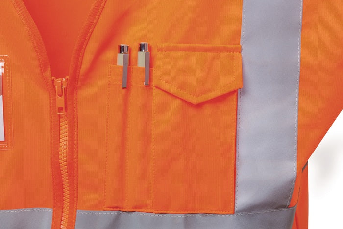 EN ISO 20471 Kl. 2, EN ISO 13688 · Obermaterial: 100% Polyester · mit Schulterreflex · mit robustem Front-Reißverschluss · einzeln im PE-Beutel verpackt · 1 Brusttaschenkombination links mit Handytasche und Stifttaschen · 1 Ausweistasche · 2 Zwei-Wege-Hüfttaschen auf Anfrage lieferbare Größen: S-7XL