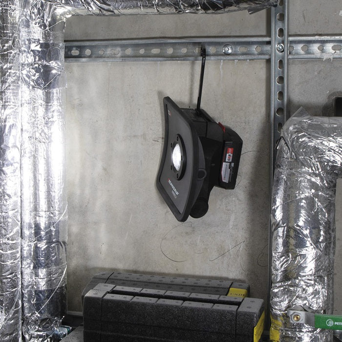 kompakter Baustrahler mit 2000 Lumen · COB-LED-Hochleistungstechnologie · Dimmfunktion · flexible Stütze und Haken · eingebaute Powerbank mit USB-Buchse · Schutzart IP30