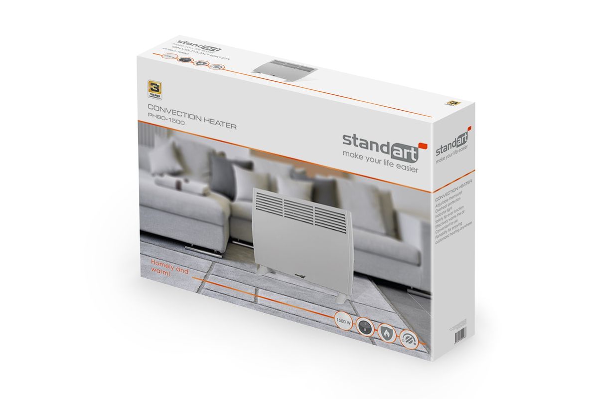 STANDART PH80-1500 ist ein weißer, mechanisch gesteuerter Konvektionsheizkörper mit einer Leistung von 1,5 kW (1500 W). Der Heizkörper eignet sich zum Heizen von Räumen mit einer Gesamtfläche von nicht mehr als 15 m². Auf der Oberseite des Heizkörpers befinden sich zwei Schalter, die den Betrieb des Heizkörpers regulieren. Unter den Schaltern befindet sich ein Licht, das aufleuchtet, wenn der Heizkörper eingeschaltet ist. Das Gerät kann in zwei Heizstufen (stark und schwächer) betrieben werden. Unter den Vorteilen sind der Schutz vor Überhitzung und ein relativ geringes Gewicht zu nennen, was die Mobilität des Heizkörpers nicht einschränkt.