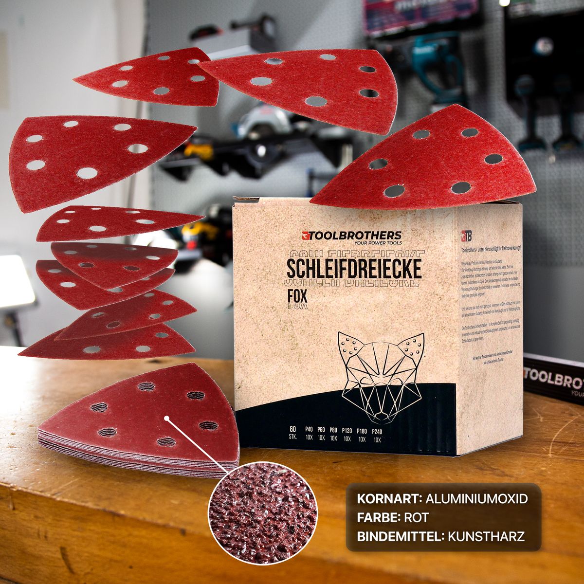 Toolbrothers FOX Schleifset Delta Schleifdreiecke 4 Packungen 93 x 93 x 93 mm Klett 6 Loch je 40x P40 / P60 / P80 / P120 / P180 / 240 für Hartholz, Weichholz, Lack, Stein, Stahl, Aluminium, Furnier