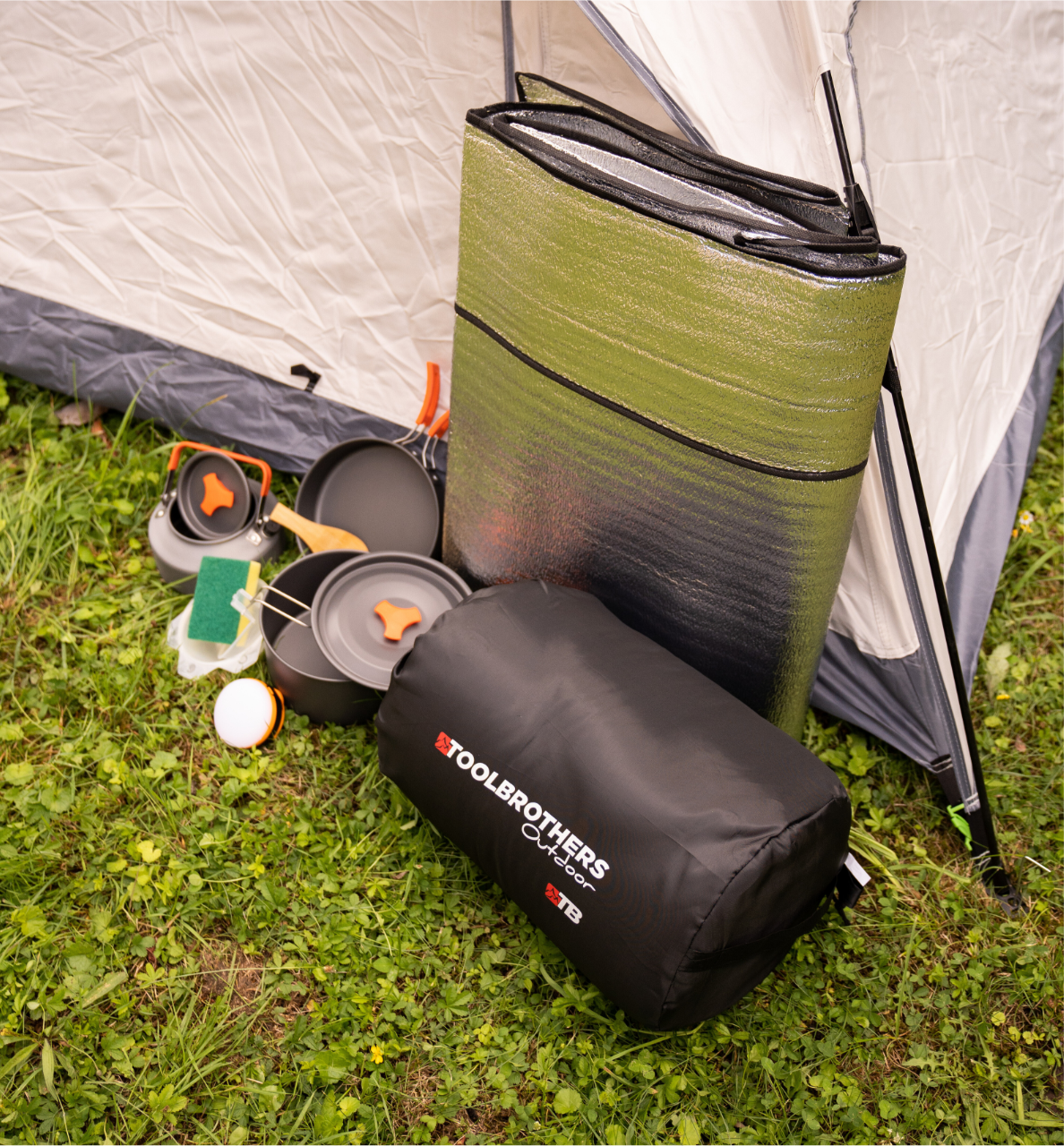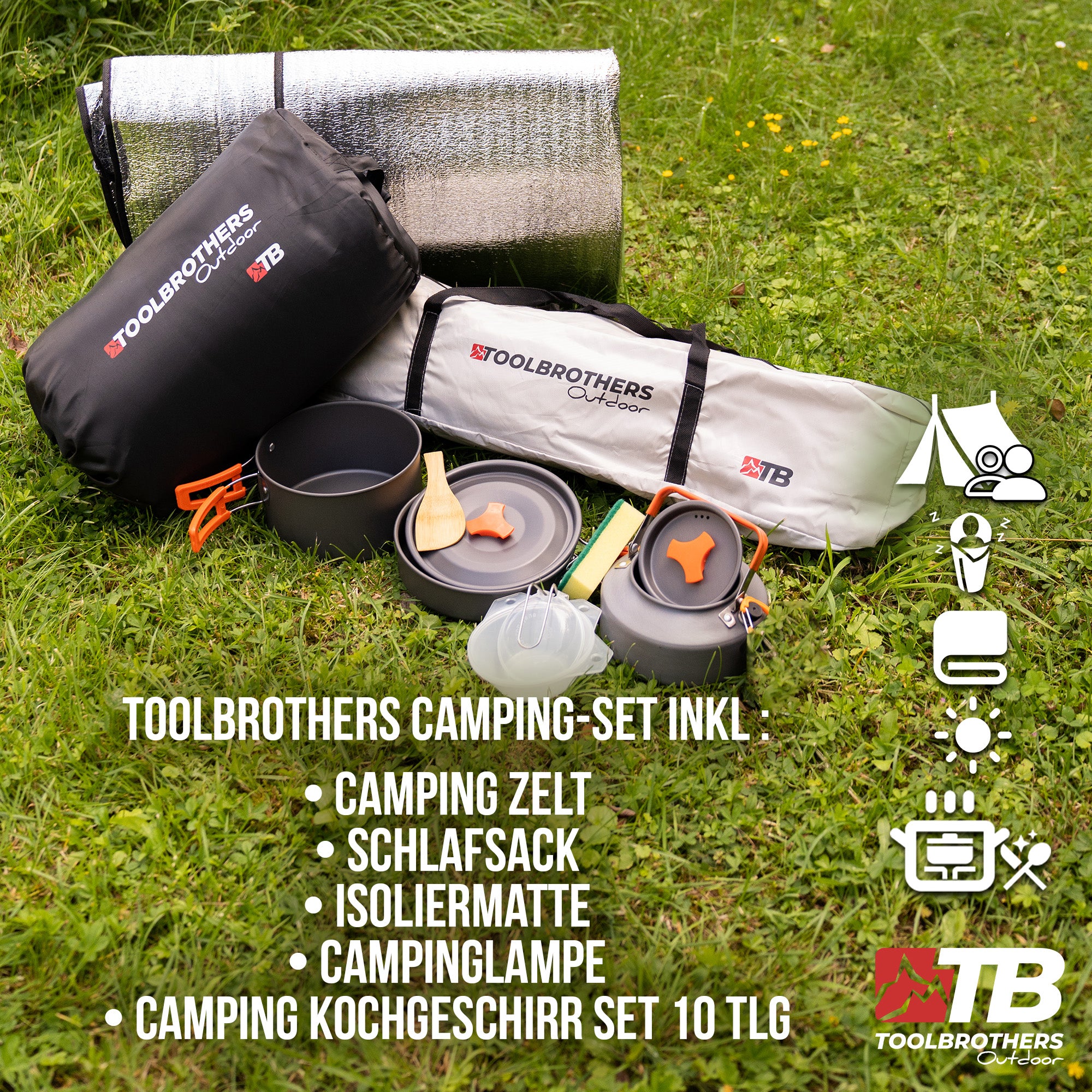 Das Toolbrothers Camping-Set ist ein hochwertiges Set, Es enthält eine Auswahl an Produkten, die für ein komfortables Camping-Erlebnis gedacht sind, das Campingzelt von Toolbrothers  speziell für den Outdoor-Einsatz entwickelt wurde. Es bietet Platz für 2-4 Personen und eignet sich perfekt für Campingausflüge oder andere Outdoor-Abenteuer, Zelt besteht aus wasserdichtem 210D Oxford-Stoff, das eine zuverlässige und langanhaltende Wasserdichtigkeit bietet. Zusätzlich ist die obere Abdeckung mit einer Taudichte versehen, um zusätzlichen Schutz vor Feuchtigkeit zu gewährleisten. das Zelt verfügt über eine 360-Grad-Belüftung, die für eine optimale Luftzirkulation sorgt. Dies ist besonders wichtig, um die Bildung von Kondensation im Zeltinneren zu minimieren und ein angenehmes Raumklima zu schaffen. Die Belüftungsschlitze können geöffnet oder geschlossen werden, je nach den aktuellen Wetterbedingungen und Ihren persönlichen Vorlieben, eine Isoliermatte aus Aluminiumfolie ist im Zelt integriert, um Ihnen zusätzliche Wärmeisolierung zu bieten. Dies ist besonders nützlich bei kälteren Temperaturen oder in höheren Lagen, um die Wärme im Zeltinneren zu halten und für mehr Komfort zu sorgen, außerdem das Zelt ist mit einem Moskitonetz ausgestattet, um lästige Insekten fernzuhalten und Ihnen einen ungestörten Schlaf zu ermöglichen.