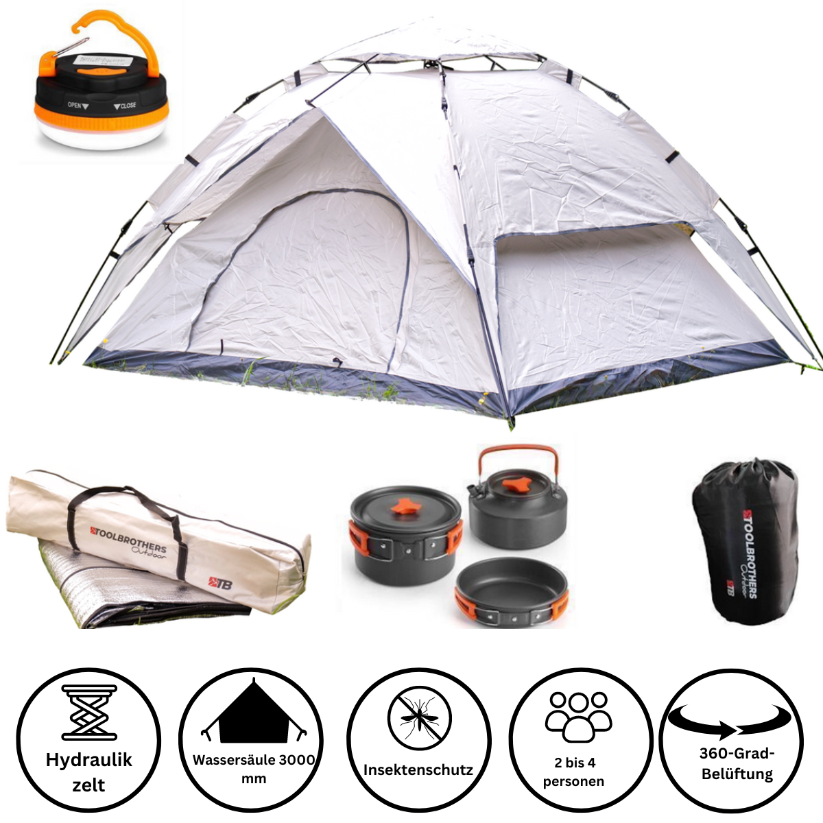Toolbrothers Outdoor Camping-Set Zelt für 2-4 Personen Hydraulikzelt mit Isoliermatte & Campingausrüstung 14 tlg