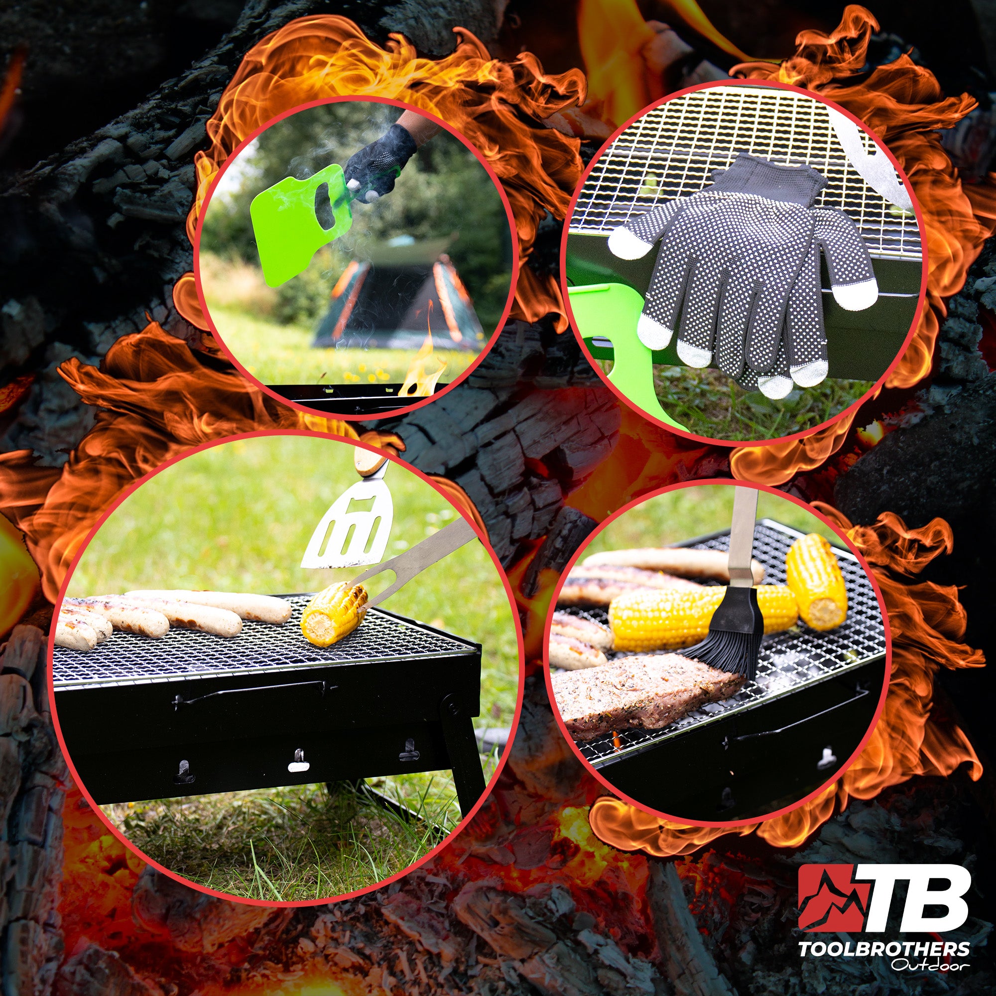 Toolbrothers Outdoor tragbarer Holzkohle Grill Set für Camping werkzeuglose Montage 43 x 29 x 23 cm schwarz + Grillbesteck, Grillhandschuhe & Grillfächer 8 tlg