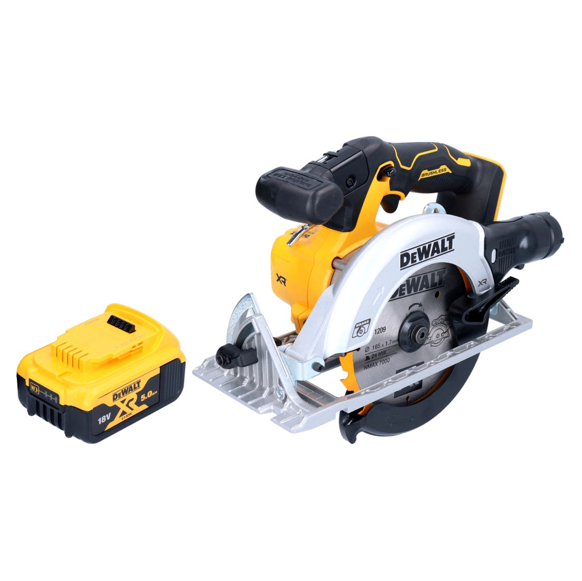 Akumulatorowa pilarka tarczowa DeWalt DCS 565 to mocna pilarka o bardzo dużej głębokości cięcia, idealna do użytku z szyną prowadzącą. Dzięki innowacyjnej technologii silnika bezszczotkowego oferuje wyższą wydajność, bardziej kompaktowe wymiary, dłuższy czas pracy na jednym ładowaniu akumulatora i dłuższą żywotność. Dzięki elektronice bezpieczeństwa przenośna pilarka tarczowa umożliwia bezproblemowe długotrwałe użytkowanie, ponieważ stale monitoruje temperaturę akumulatora, pobór prądu i ochronę przed rozładowaniem. Ponadto elektroniczny hamulec silnika i wyłącznik blokujący zapewniają bezpieczne użytkowanie. Przenośna pilarka tarczowa jest wszechstronna, ponieważ głębokość cięcia i kąt nachylenia można regulować precyzyjnie, szybko i bez użycia narzędzi. Precyzyjne skalowanie i stałe zaczepy pod kątem 22,5° i 45° sprawiają, że jest to szczególnie łatwe. Precyzyjne cięcia wzdłużne są możliwe dzięki precyzyjnie regulowanej przykładnicy wzdłużnej. Brzeszczot można szybko i łatwo wymienić dzięki blokadzie wrzeciona i zintegrowanemu kluczowi montażowemu. Wytrzymała, odporna na skręcanie aluminiowa stopa piły zapewnia długą żywotność. Pomimo swojej wydajności, przenośna pilarka tarczowa jest łatwa w obsłudze i prowadzeniu dzięki swoim kompaktowym wymiarom. Nawet w słabych warunkach oświetleniowych, skrócona osłona ochronna w przedniej części, zintegrowana dioda LED i urządzenie nadmuchowe umożliwiają nieograniczoną widoczność cięcia. Ręczna pilarka tarczowa jest wytrzymała, a jednocześnie lekka, ponieważ obudowa przekładni i osłona ochronna są wykonane z wysokiej jakości aluminium. Kompaktowa i dobrze wyważona konstrukcja, a także gumowane, ergonomiczne uchwyty i dodatkowe rękojeści zapewniają bezpieczeństwo i komfort pracy. Przenośna pilarka tarczowa jest wyposażona w system odsysania pyłu kompatybilny z systemem Airlock, zapewniający skuteczne odsysanie pyłu. Tarcza pilarska umieszczona po lewej stronie umożliwia idealne prowadzenie maszyny w określonych zastosowaniach. Ręczna pilarka tarczowa może być używana ze wszystkimi akumulatorami 18 V XR lub 54 V XR FLEXVOLT.
