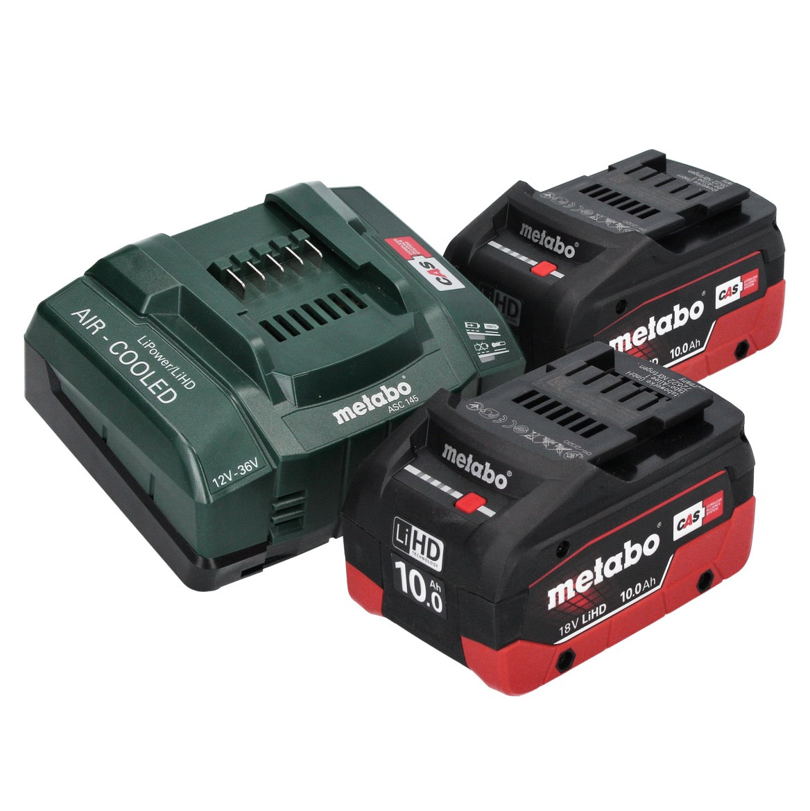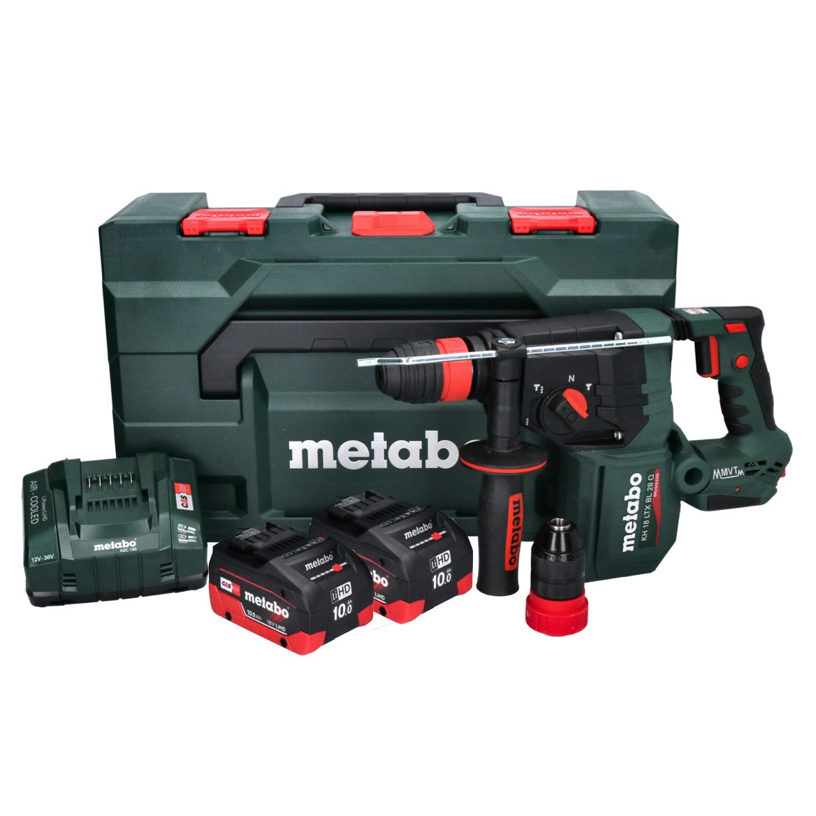 - 1x akumulatorowy młot udarowo-obrotowy Metabo KH 18 LTX BL 28 Q - 1x uchwyt udarowy do narzędzi z końcówką SDS-plus - 1x szybkomocujący uchwyt wiertarski do narzędzi z chwytem cylindrycznym - 1x gumowany uchwyt dodatkowy - 1x ogranicznik głębokości wiercenia - 2x akumulator Metabo LiHD 18 V 10,0 Ah ( 625549000 ) system CAS - 1x ładowarka Metabo ASC 145 ( 627378000 ) - 1x Metabo metaBOX