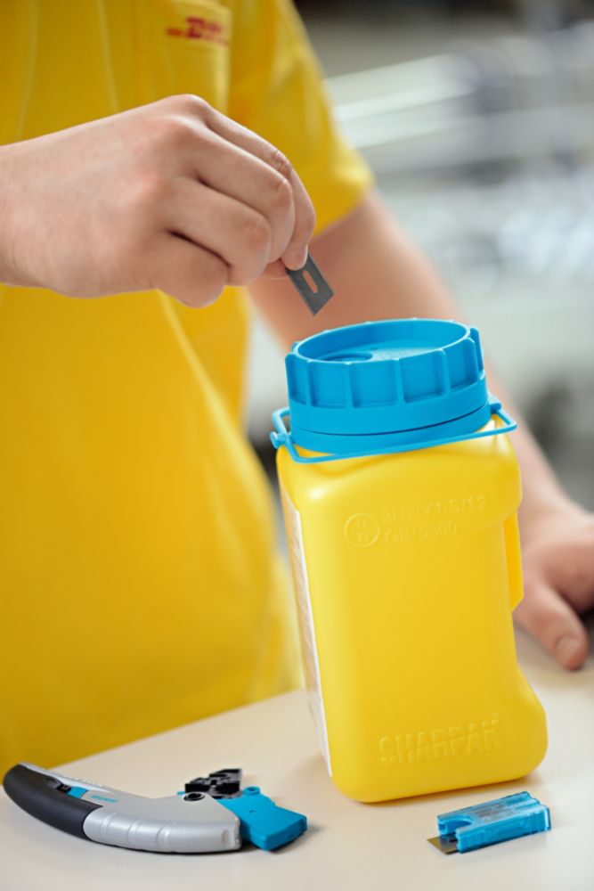 pojemny plastikowy pojemnik do zbierania, przechowywania i utylizacji zużytych ostrzy - po zapełnieniu pojemnika pokrywę można zamknąć do oporu, po czym pojemnika nie można już otworzyć - pojemnik z ostrzami można bezpiecznie i całkowicie zutylizować