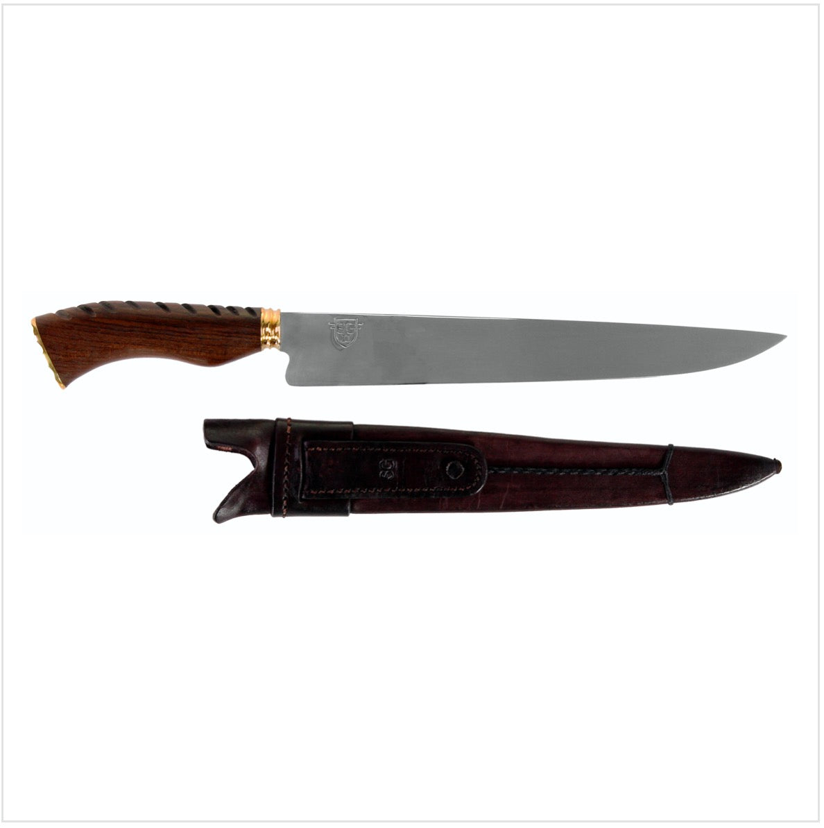 Cudowny nóż kuchenny od wysokiej jakości producenta noży Serra Grande: Ten ręcznie wykonany Faca Campeira, co tłumaczy się jako nóż wiejski lub nóż polowy, jest tradycyjnym nożem rolników i pasterzy w Ameryce Południowej. Nawet najtrudniejsze zadania, takie jak ubój, rzeź i przygotowywanie zwierząt polnych, muszą być z łatwością opanowane przy użyciu tego noża. Długość ostrza wynosząca 22,8 centymetra i grubość ostrza wynosząca 2 milimetry sprawiają, że nóż ten jest idealnym rozwiązaniem do zadań kuchennych związanych z mięsem i warzywami. Aby spełnić najwyższe standardy, do produkcji używane są tylko najlepsze materiały: Ostrze wykonane jest ze szwedzkiej stali nierdzewnej (X46Cr13 / AISI 420 C), która jest również wykorzystywana w produkcji noży Solingen, a elegancka rękojeść wykonana jest z drewna Imbuia, znanego również jako drzewo pieprzowe lub orzech brazylijski. Ciemnobrązowe drewno o drobnoporowatej strukturze ma ciemne smugi i wygląda jak drewno orzecha włoskiego, chociaż nie jest to drzewo orzechowe. Jest twarde i trwałe, a staranne suszenie, wygładzanie i polerowanie zapewnia mu wspaniały chwyt.