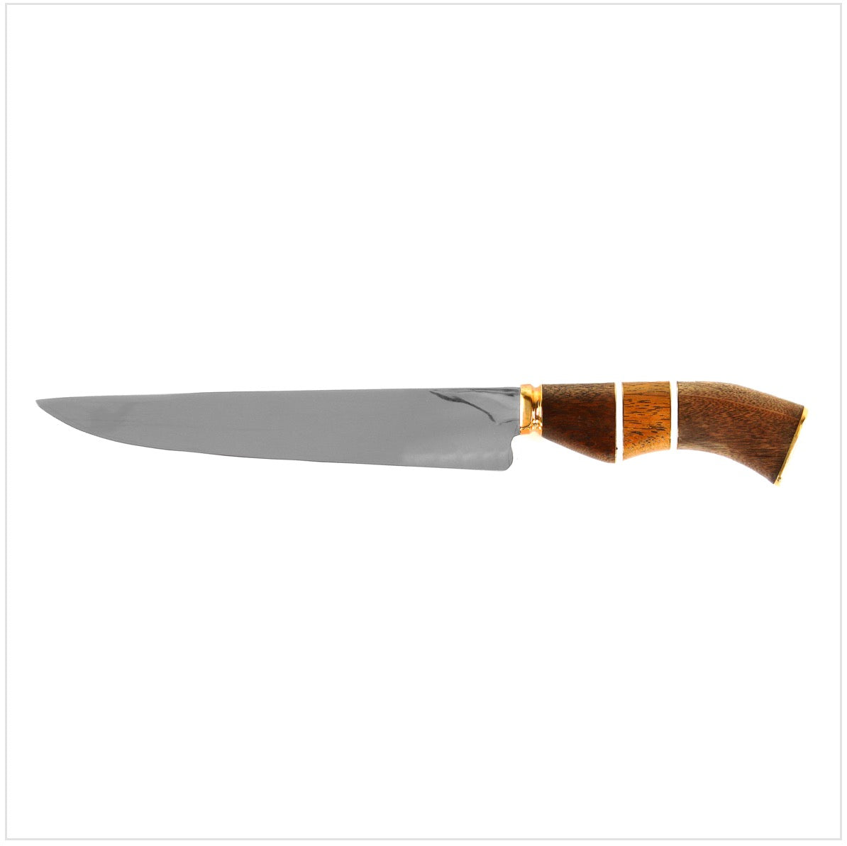Ein wunderschönes Küchenmesser mit verspieltem Griff aus der hochwertigen Messerfertigung Serra Grande: Dieses handgefertigte Faca Tradicional, was übersetzt soviel bedeutet wie traditionelles Küchenmesser, ist ein Must-have für jeden fleischbegeisterten Gaucho. Die Klingenlänge von 20,3 Zentimetern und die Klingenstärke von 3 Millimetern machen das Messer zur idealen Lösung für anfallende Küchenarbeiten mit Fleisch und Gemüse. Um höchsten Ansprüchen zu genügen, werden nur die besten Werkstoffe bei der Fertigung verwendet: Die Klinge besteht aus dem rostfreiem Schwedenstahl ( X46Cr13 / AISI 420 C ) der auch in der Solinger Messerfertigung benutzt wird. Dieser Edelstahl wird in der Fabrikation von Hand gehärtet und poliert, so daß eine edle und glänzende Optik entsteht. Der edle Griff wird aus dem Holz des Imbuia gefertigt, auch Pfefferbaum oder brasilianische Walnuß genannt. Das dunkelbraune Holz mit seiner kleinporigen Struktur weist dunkle Streifungen auf und wirkt optisch wie Nussbaumholz, obwohl es sich nicht um einen Nußbaum handelt. Es ist hart und langlebig, durch die sorgfältige Trocknung, Glättung und Politur überzeugt es mit einer wunderbaren Griffigkeit.
